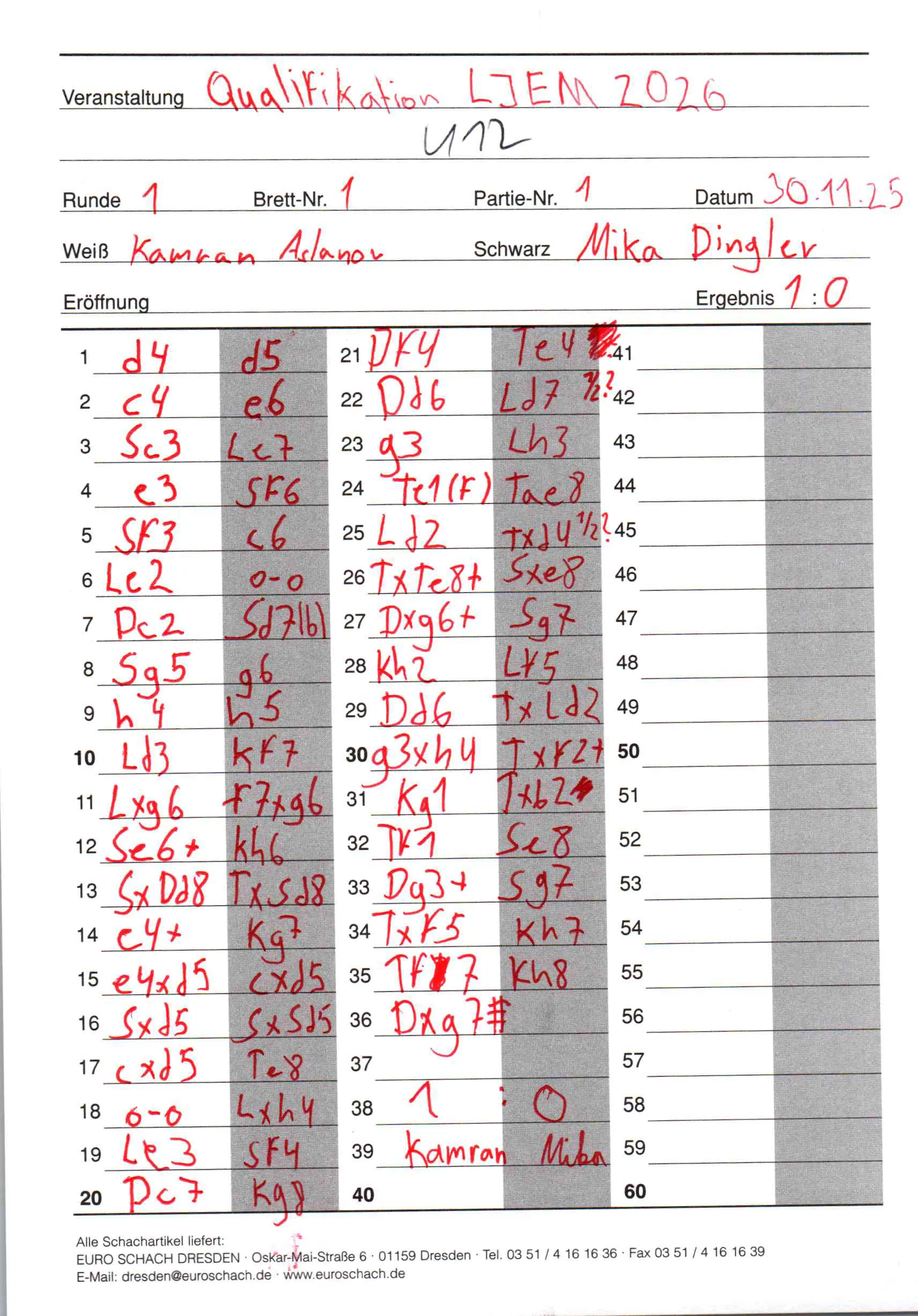| Weiß: | Aslanov, Kamran | Schwarz: | Dingler, Mika |