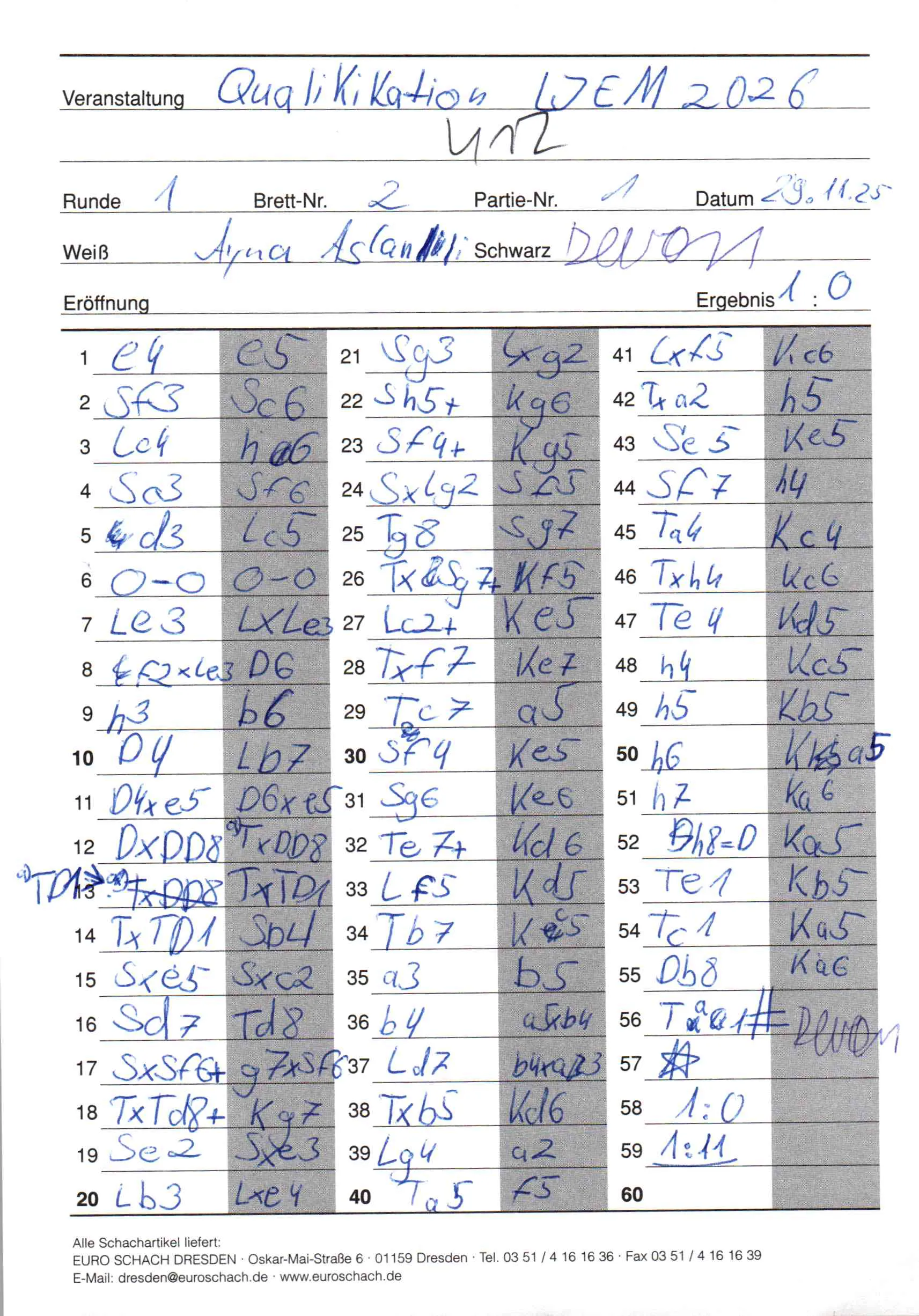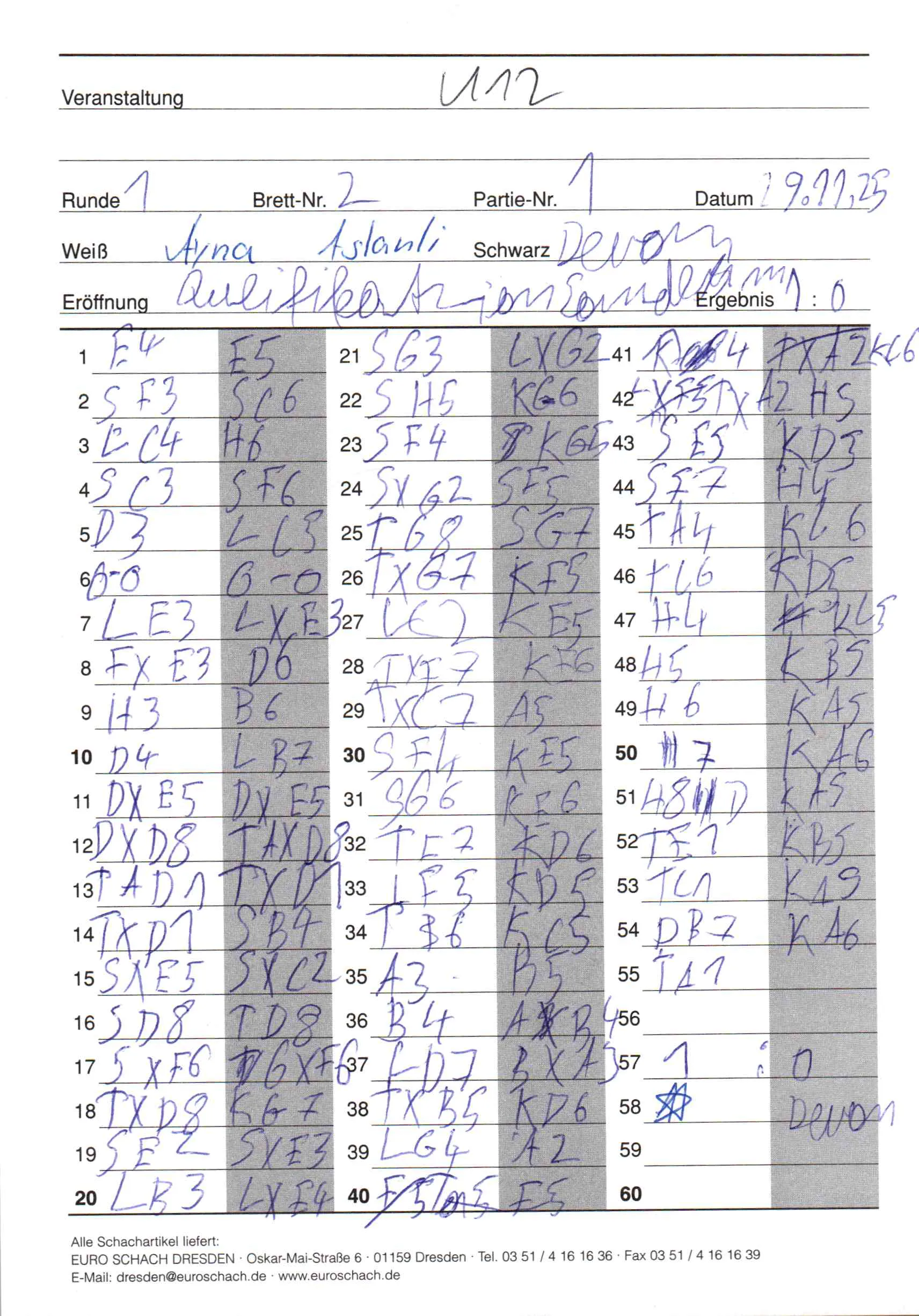 | Weiß: | Aslanli, Ayna | Schwarz: | Hammerich, Devon |