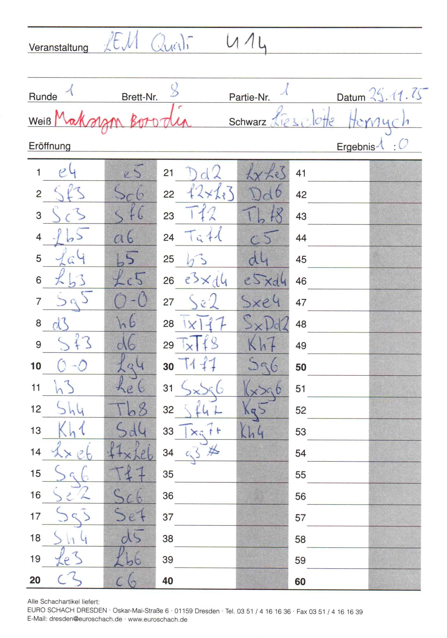 | Weiß: | Borodin, Maksym | Schwarz: | Hornych, Lieselotte |