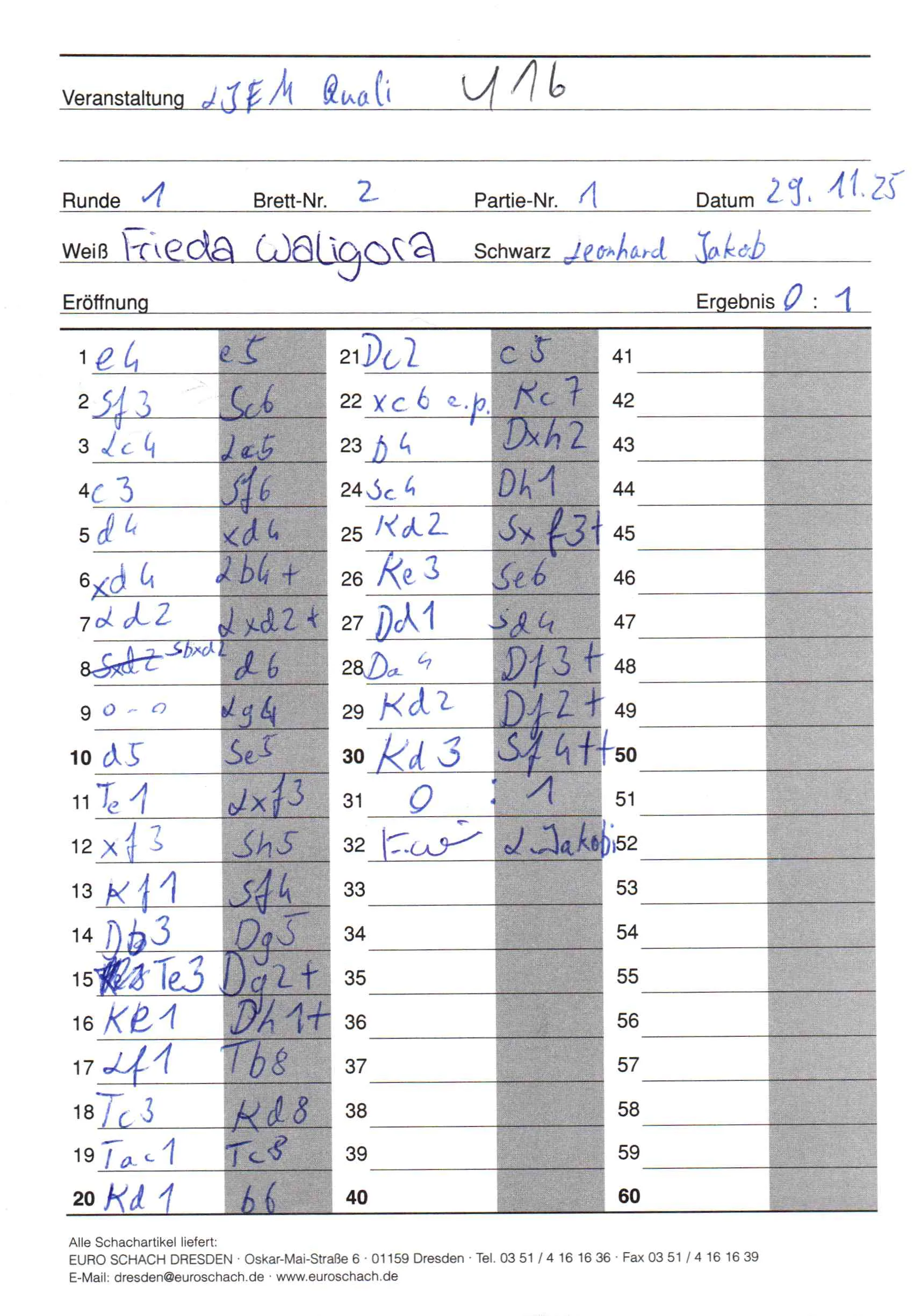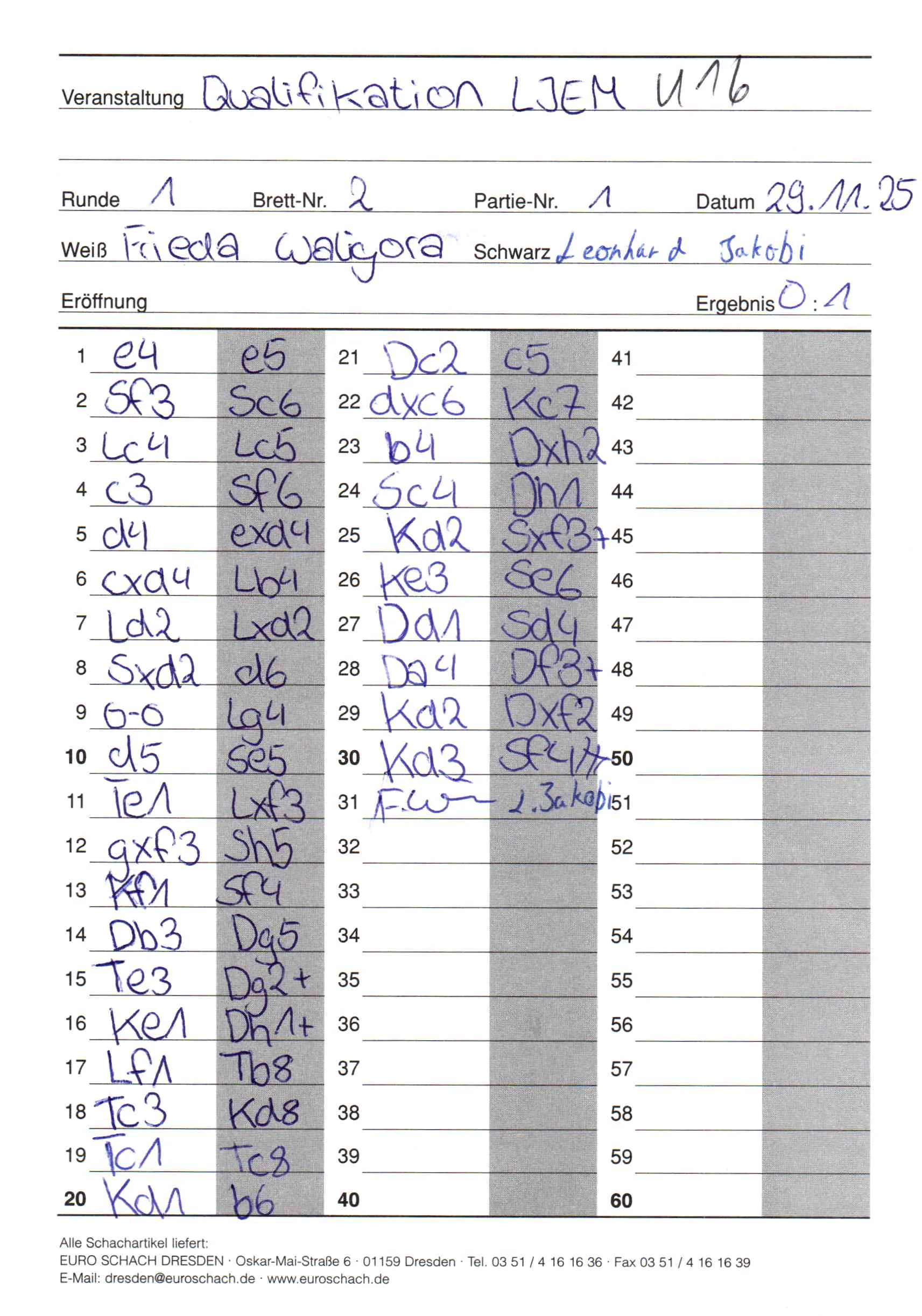 | Weiß: | Waligora, Frieda | Schwarz: | Jakobi, Paul Leonhard |