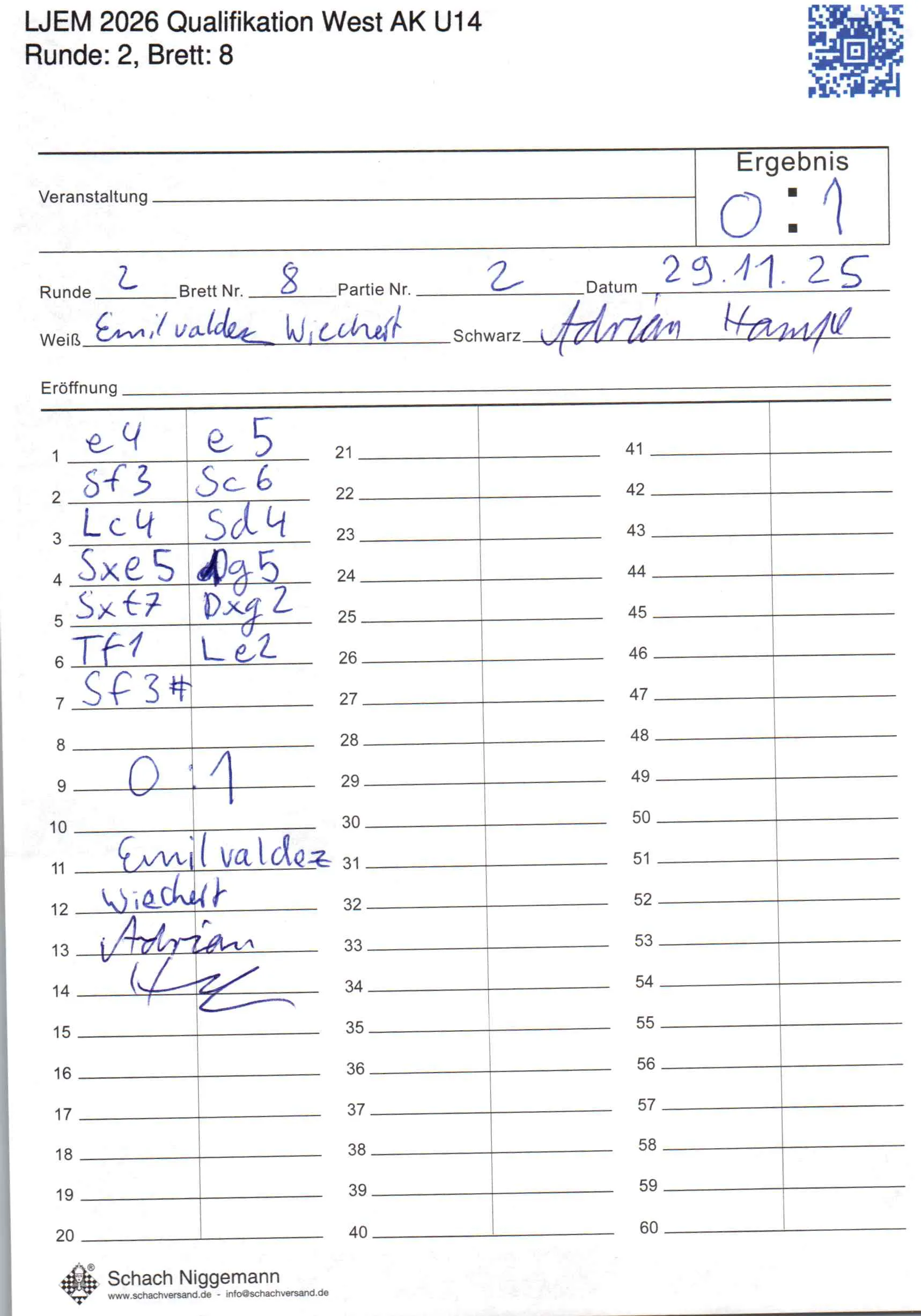 | Weiß: | Wiechert, Emil | Schwarz: | Hampe, Adrian |