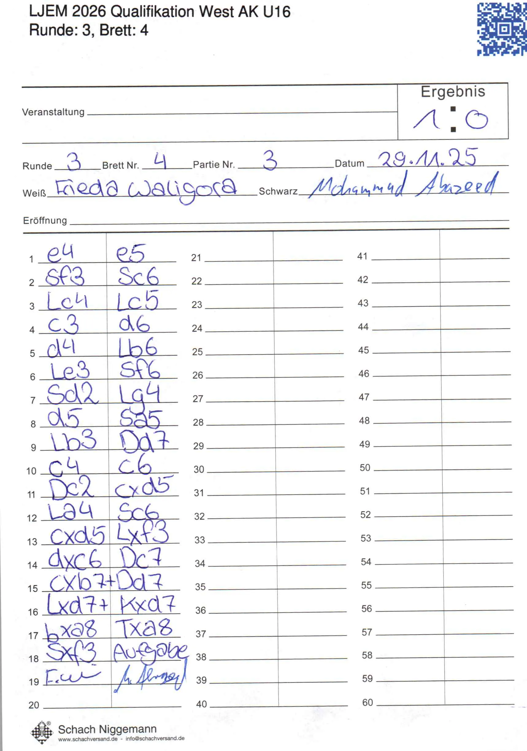 | Weiß: | Waligora, Frieda | Schwarz: | Abazeed, Mohammad |