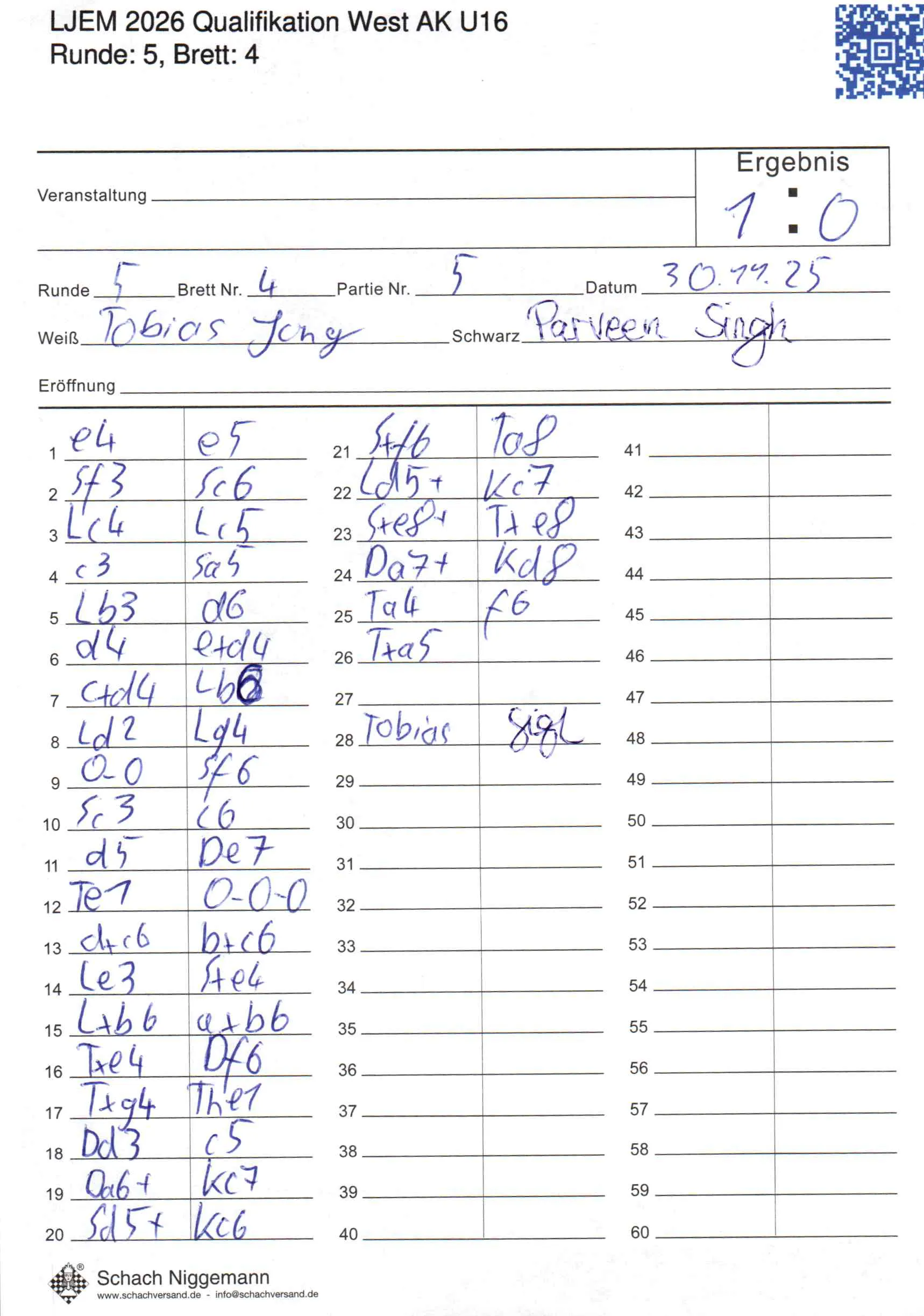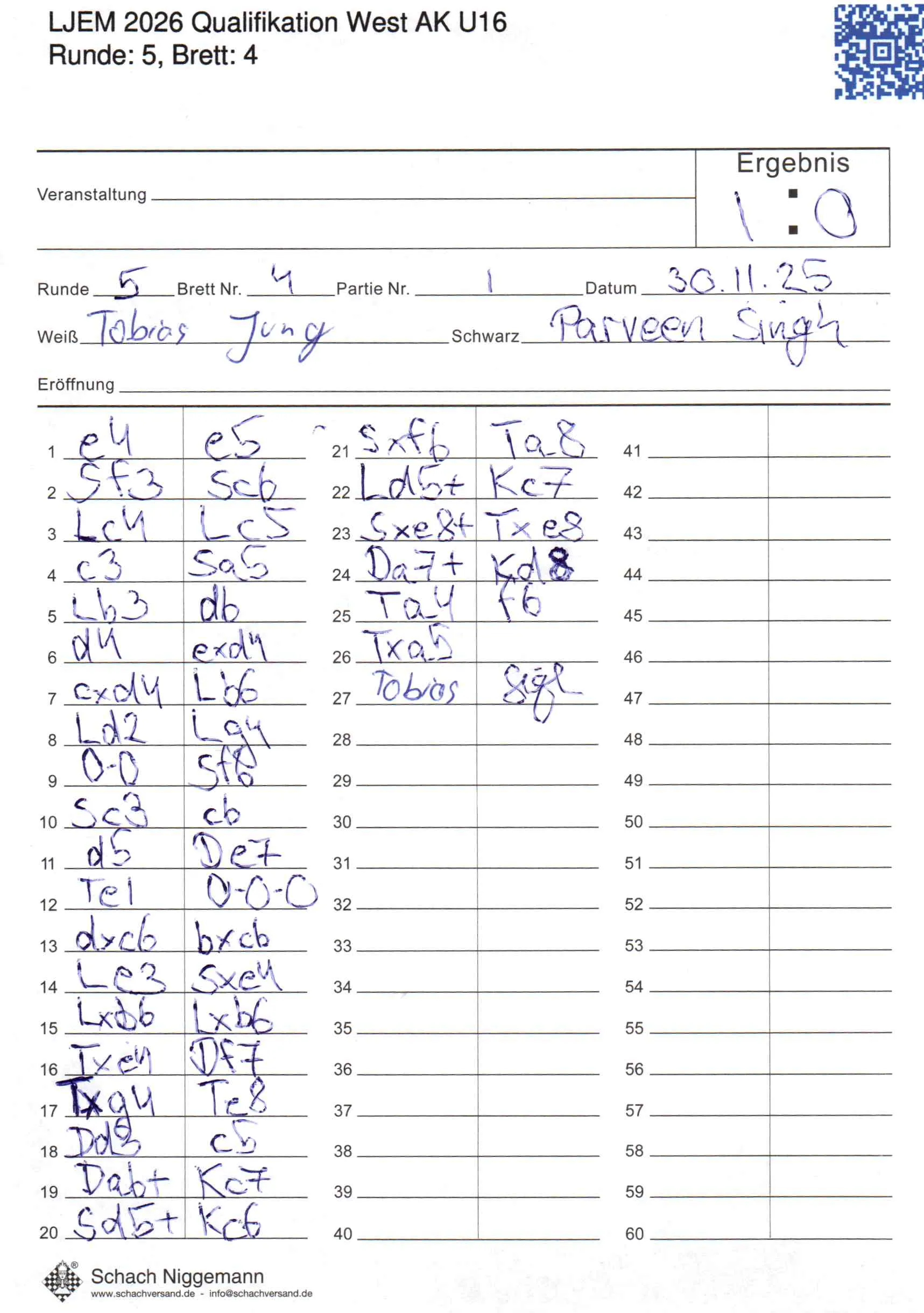 | Weiß: | Jung, Tobias | Schwarz: | Singh, Parveen Satnam Leon |