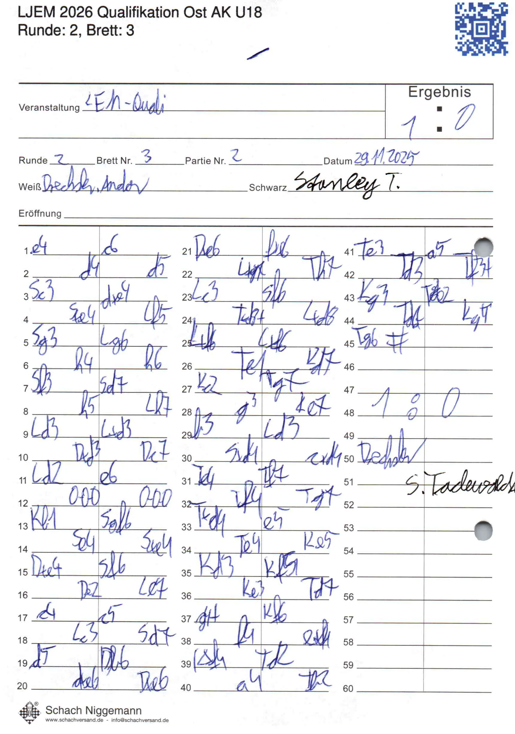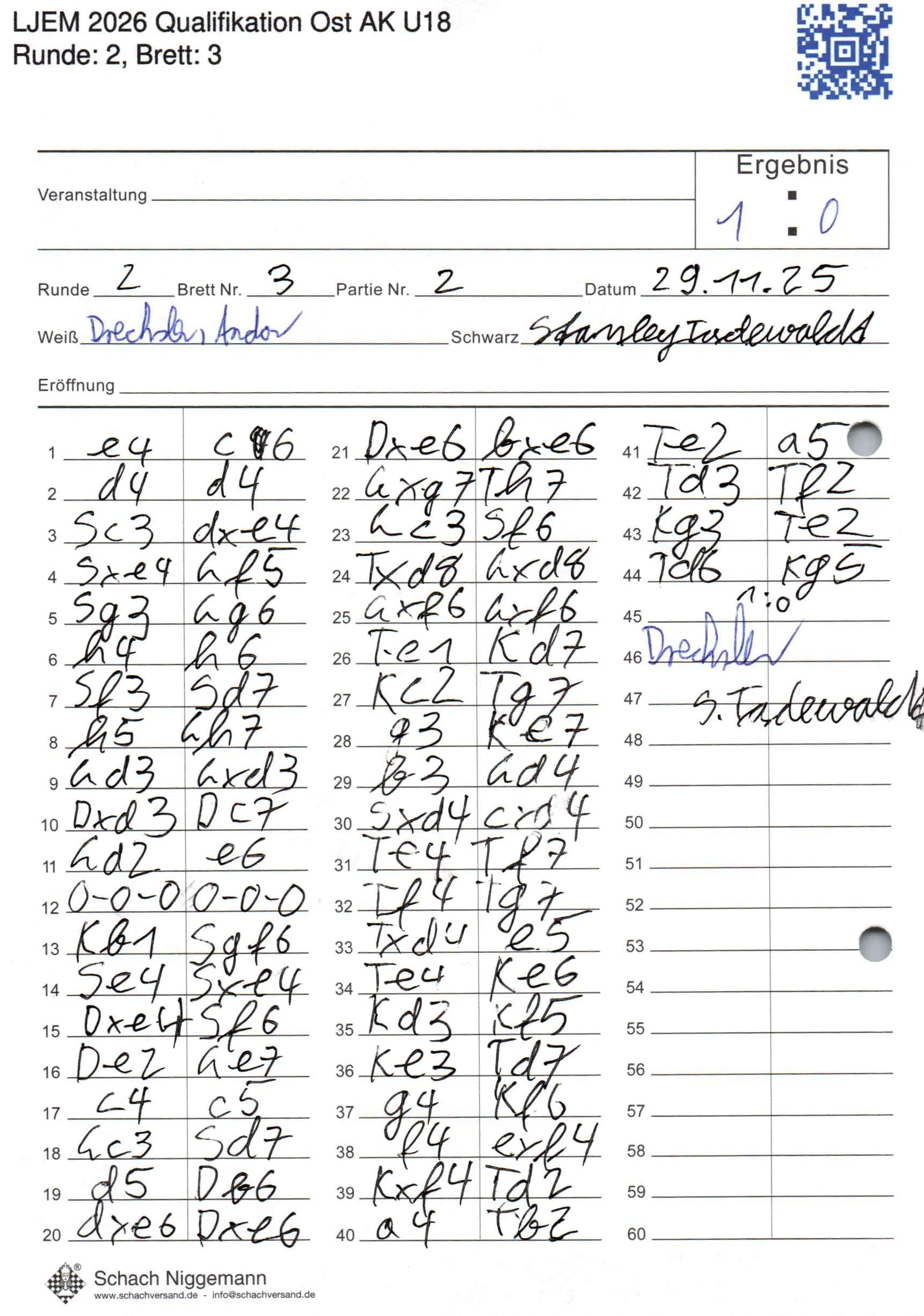 | Weiß: | Drechsler, Andor | Schwarz: | Tadewaldt, Stanley |