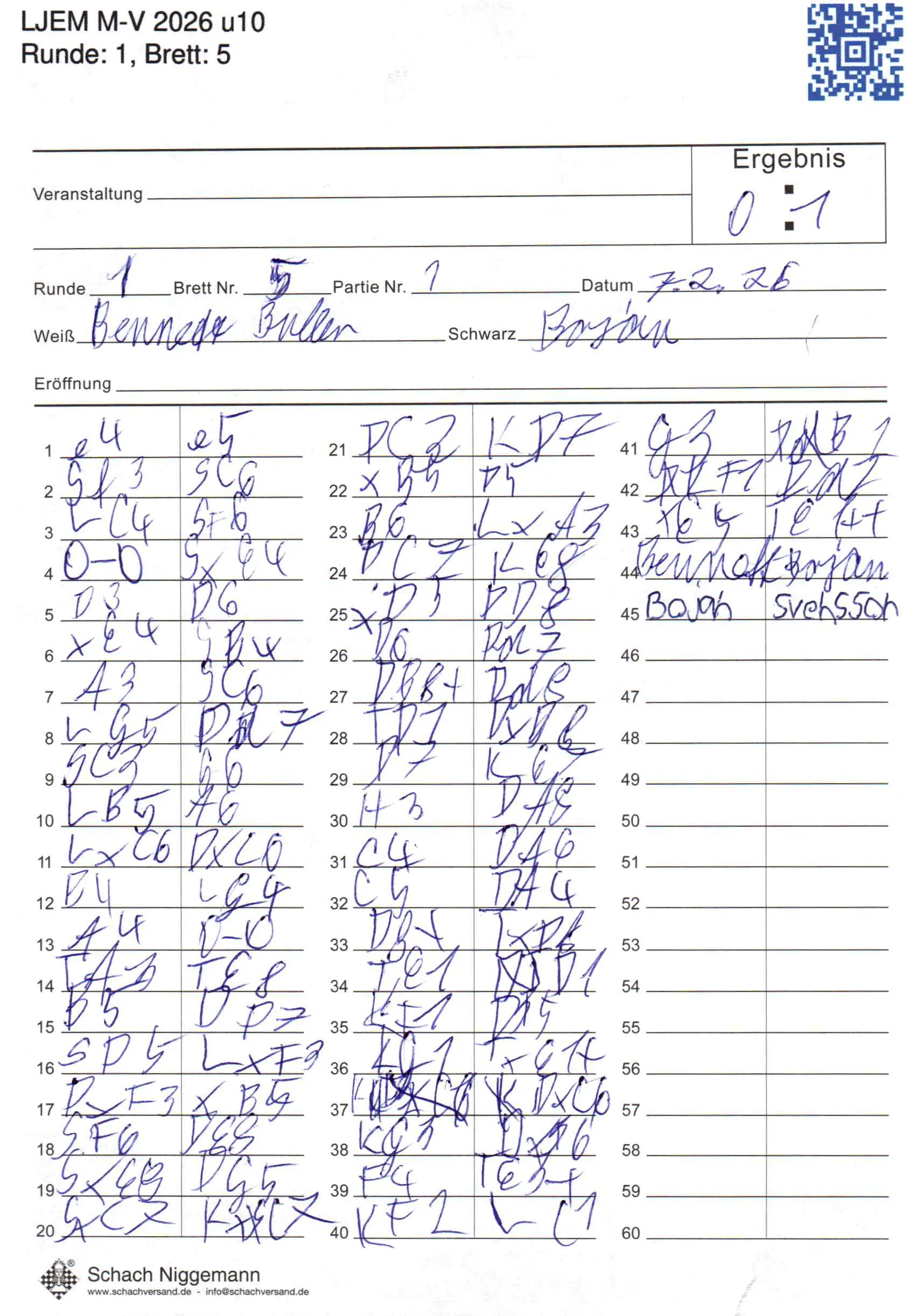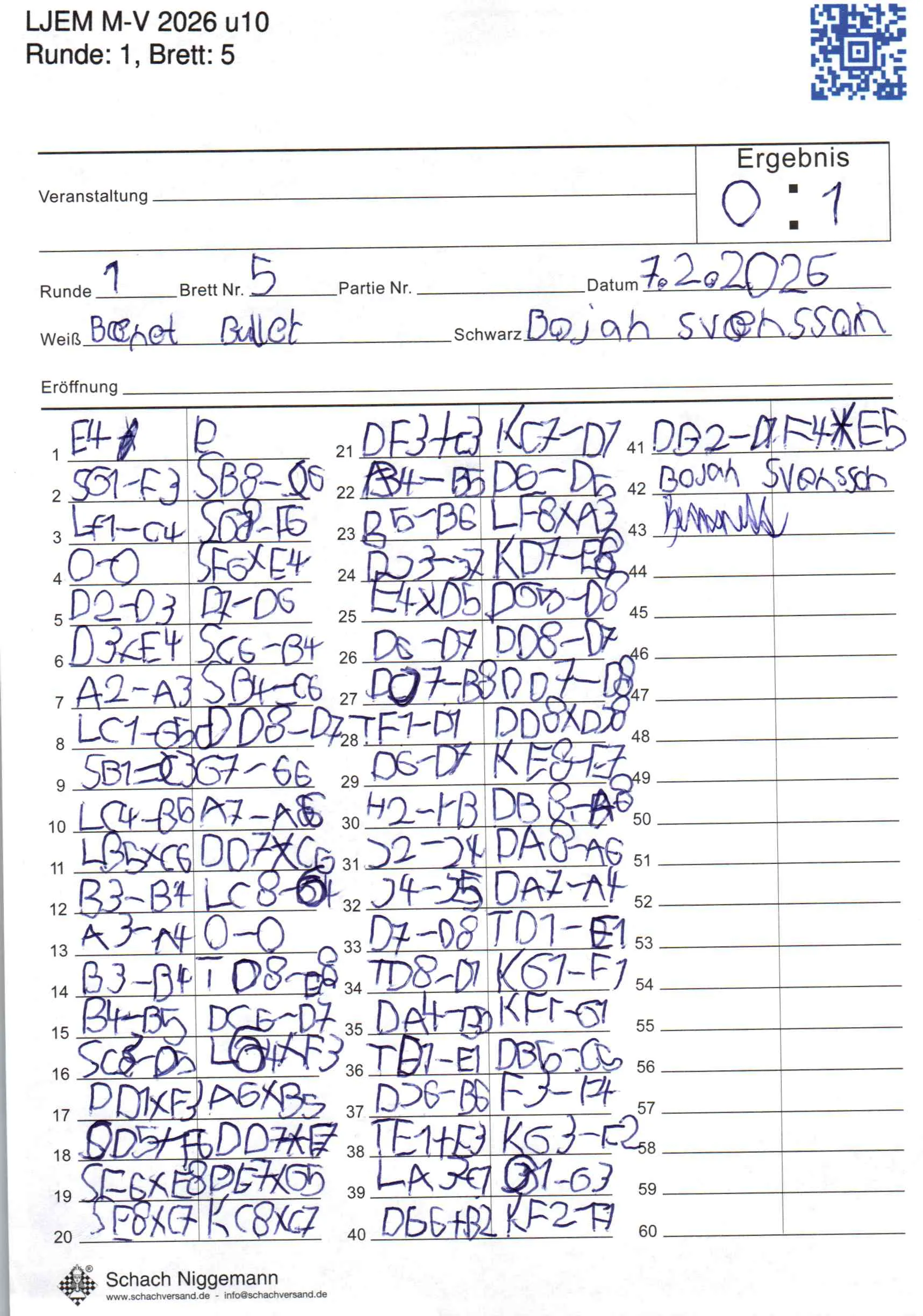| Weiß: | Buller, Bennett | Schwarz: | Svenson, Bojan |