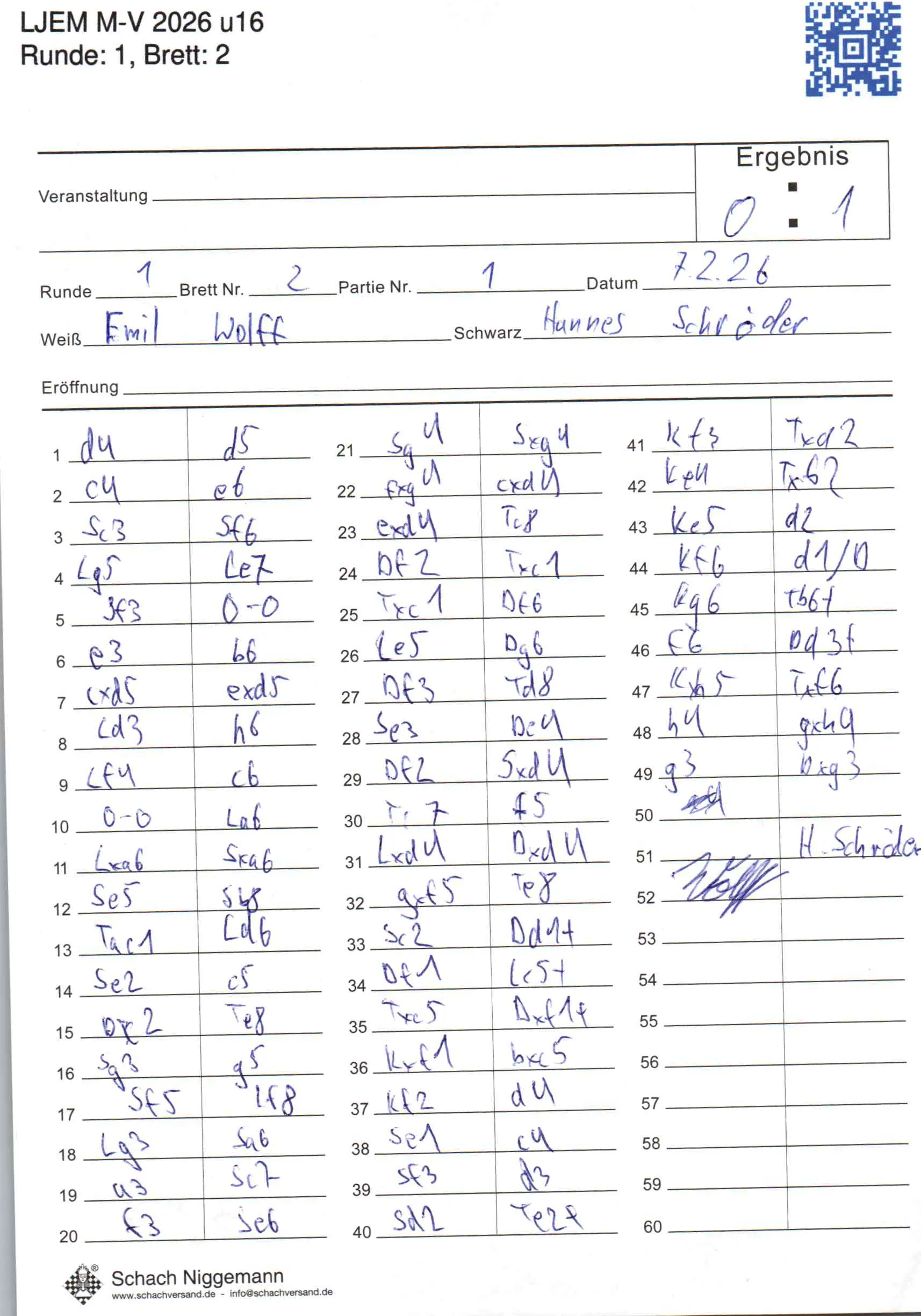 | Weiß: | Wolff, Emil | Schwarz: | Schröder, Hannes Artur |