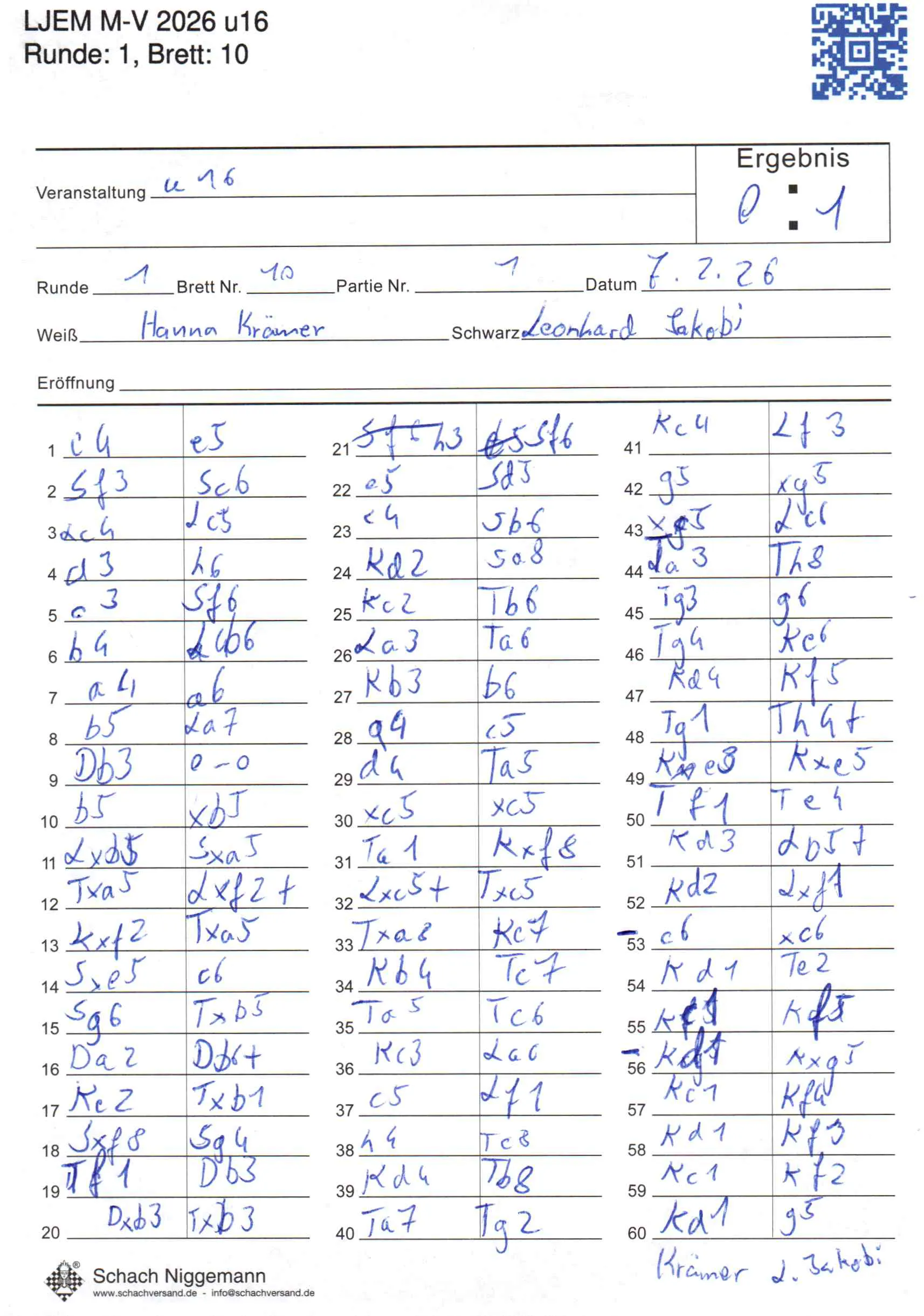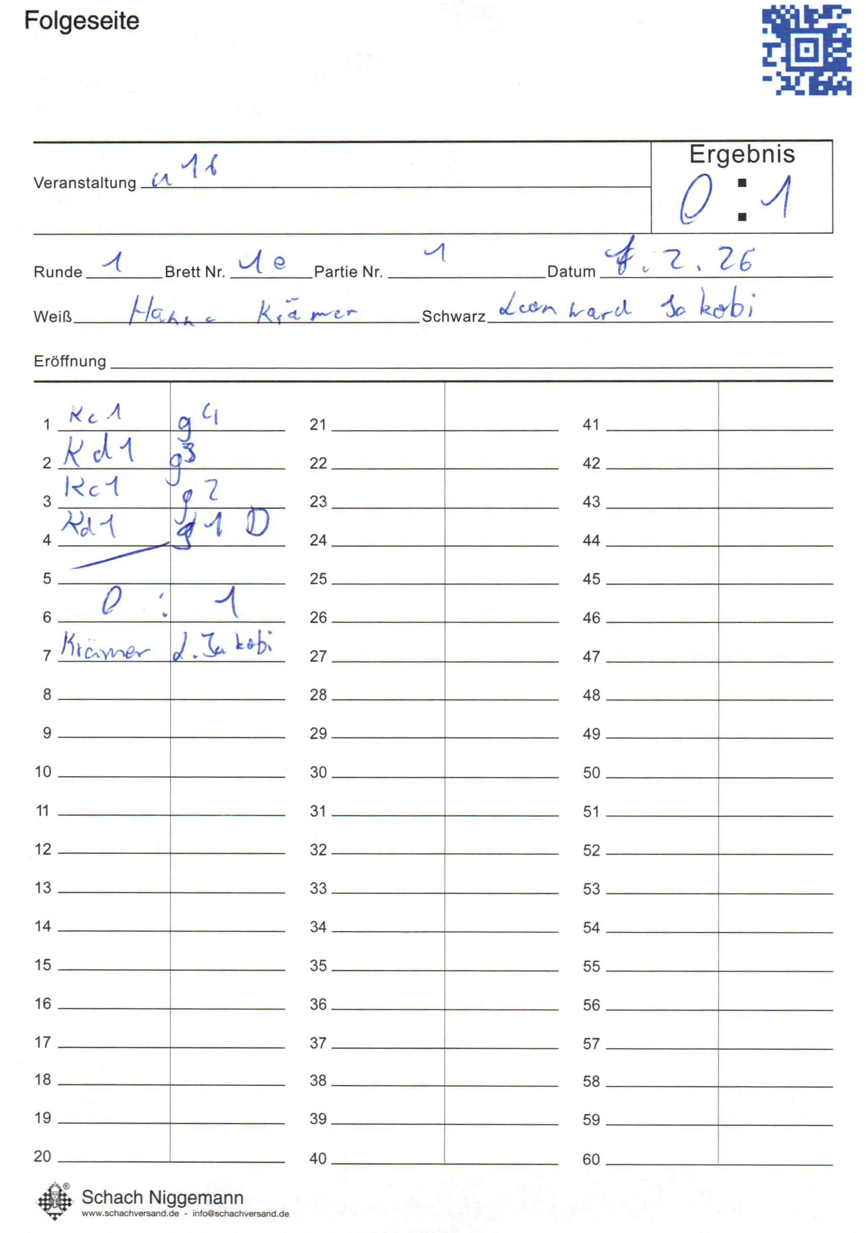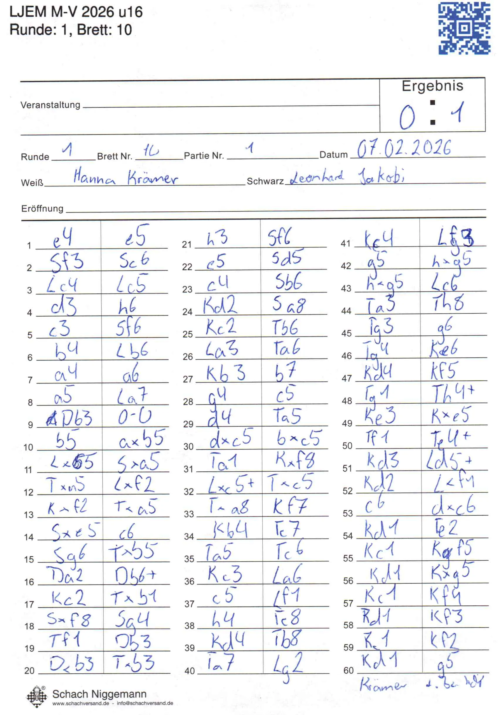 | Weiß: | Krämer, Hanna Sophie | Schwarz: | Jakobi, Paul Leonhard |