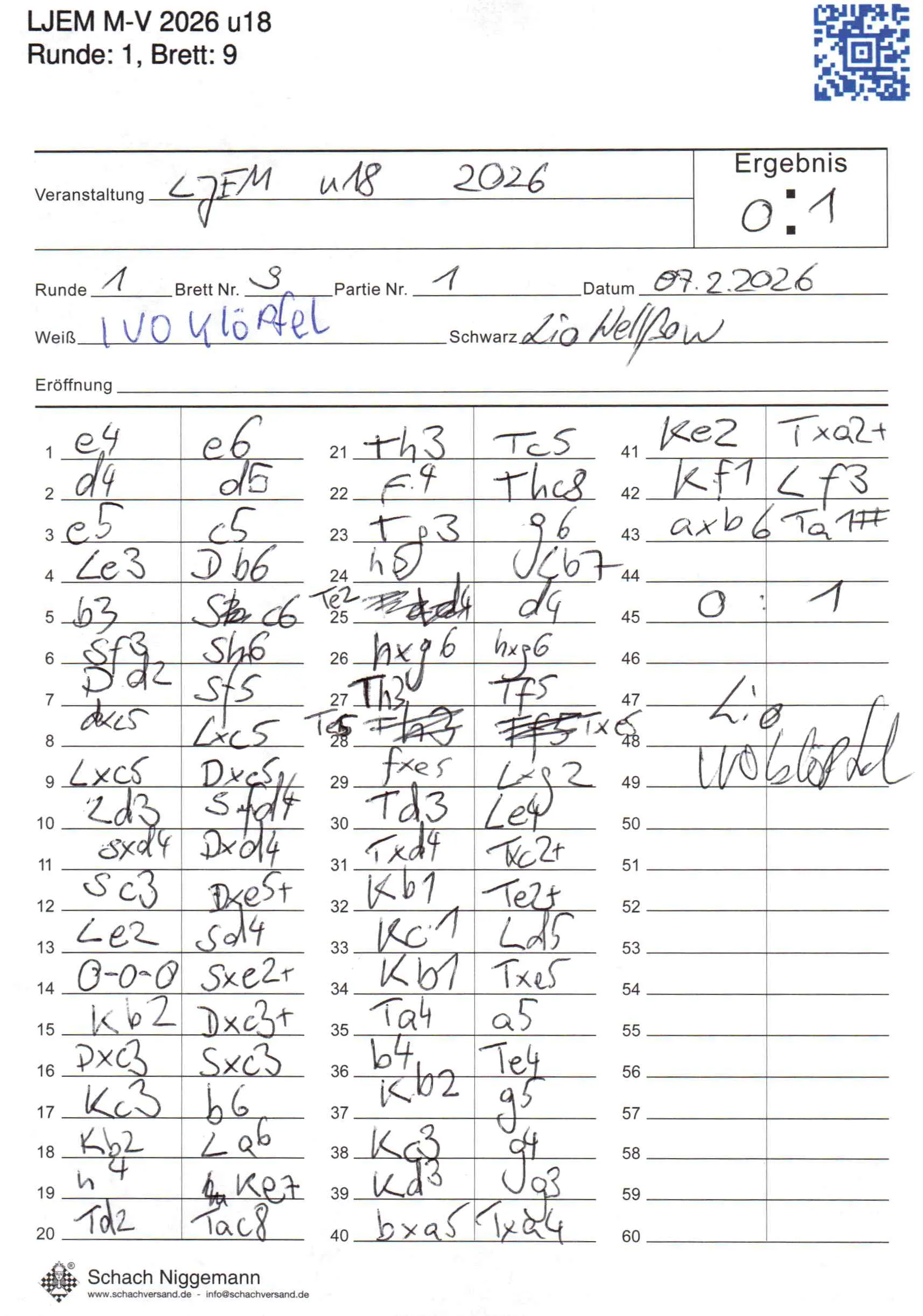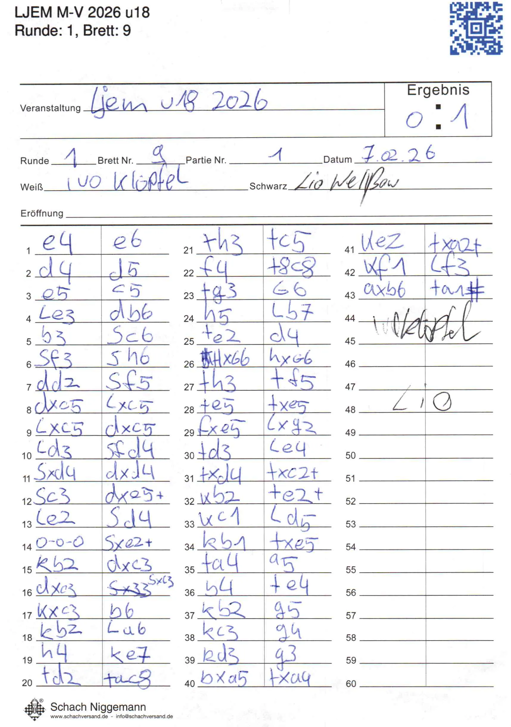 | Weiß: | Klöpfel, Ivo | Schwarz: | Wellßow, Lio Keanu |