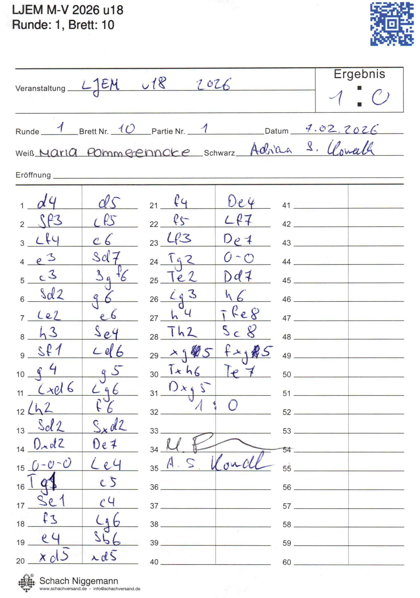 | Weiß: | Pommerehncke, Marla | Schwarz: | Kowalk, Adriana Sophie |