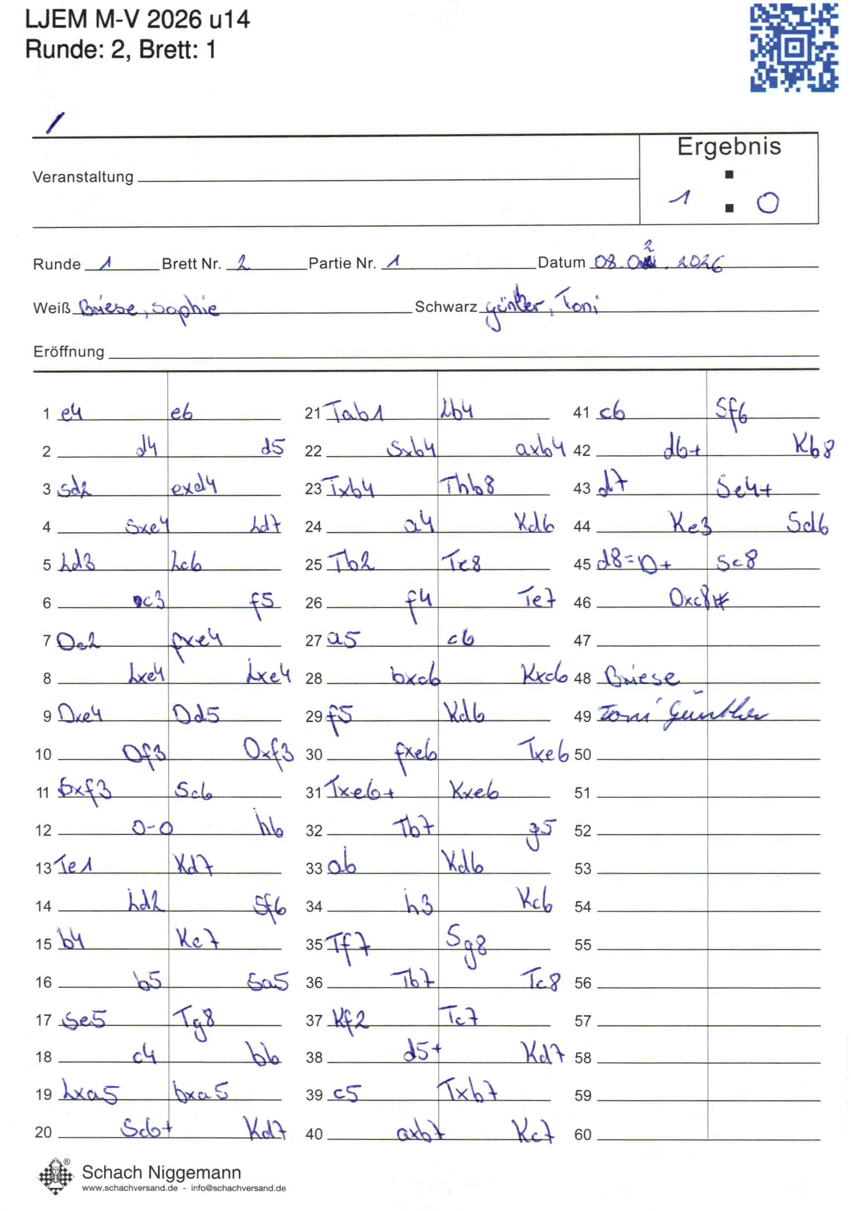 | Weiß: | Briese, Sophie | Schwarz: | Günther, Toni |