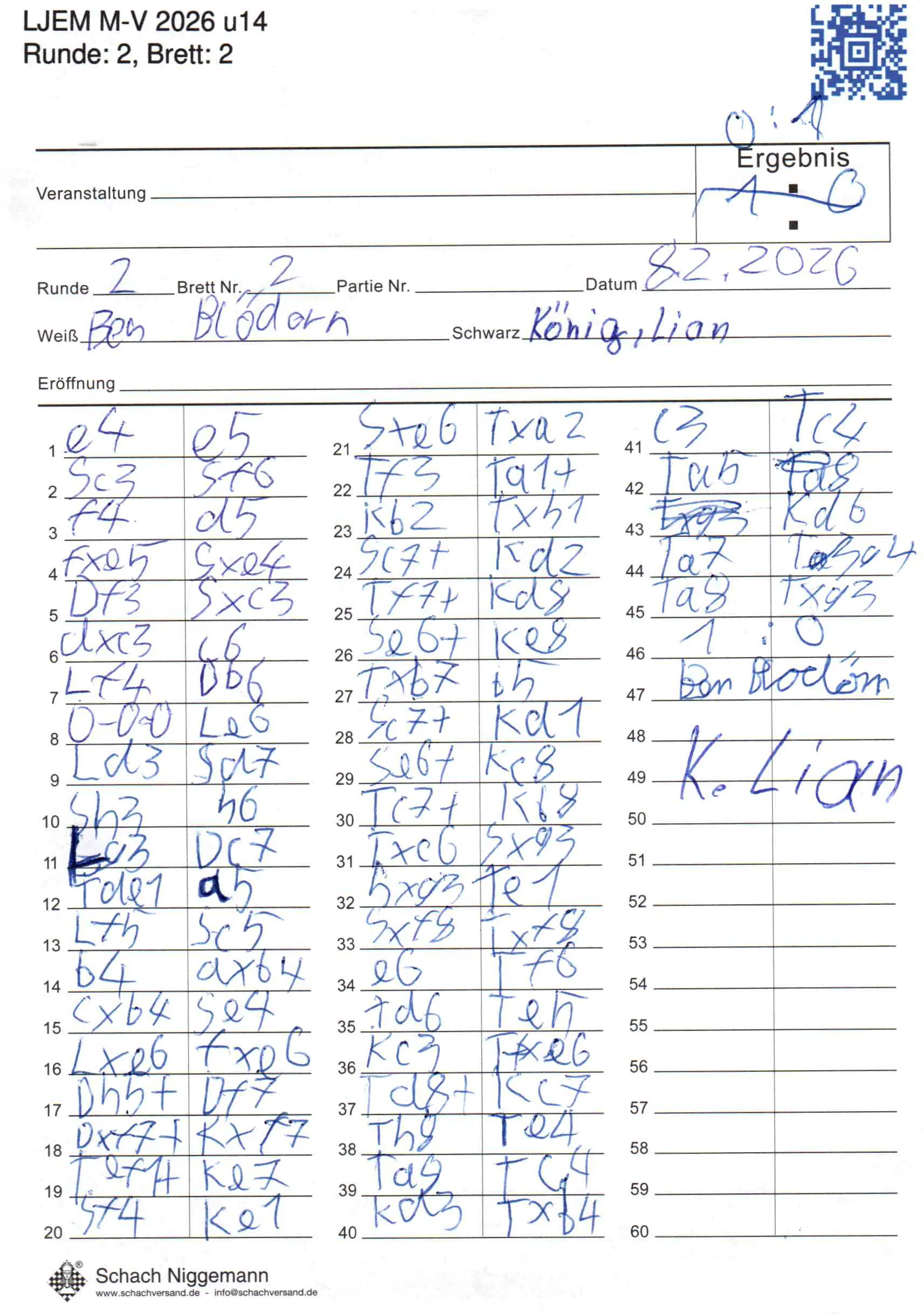 | Weiß: | Blödorn, Ben | Schwarz: | König, Lian |