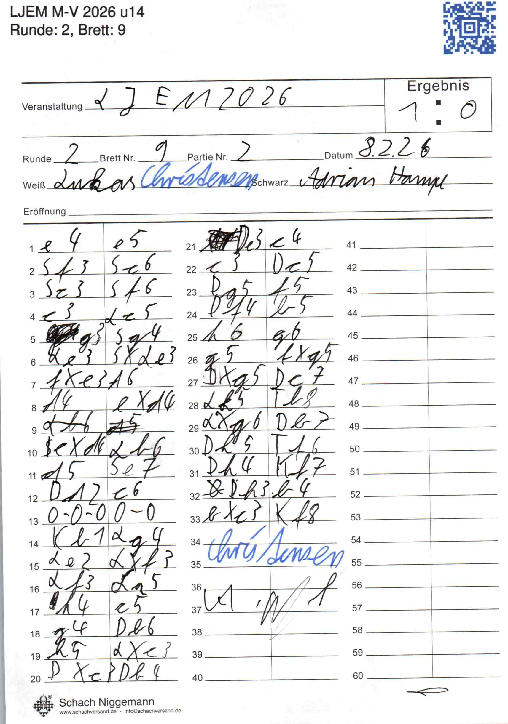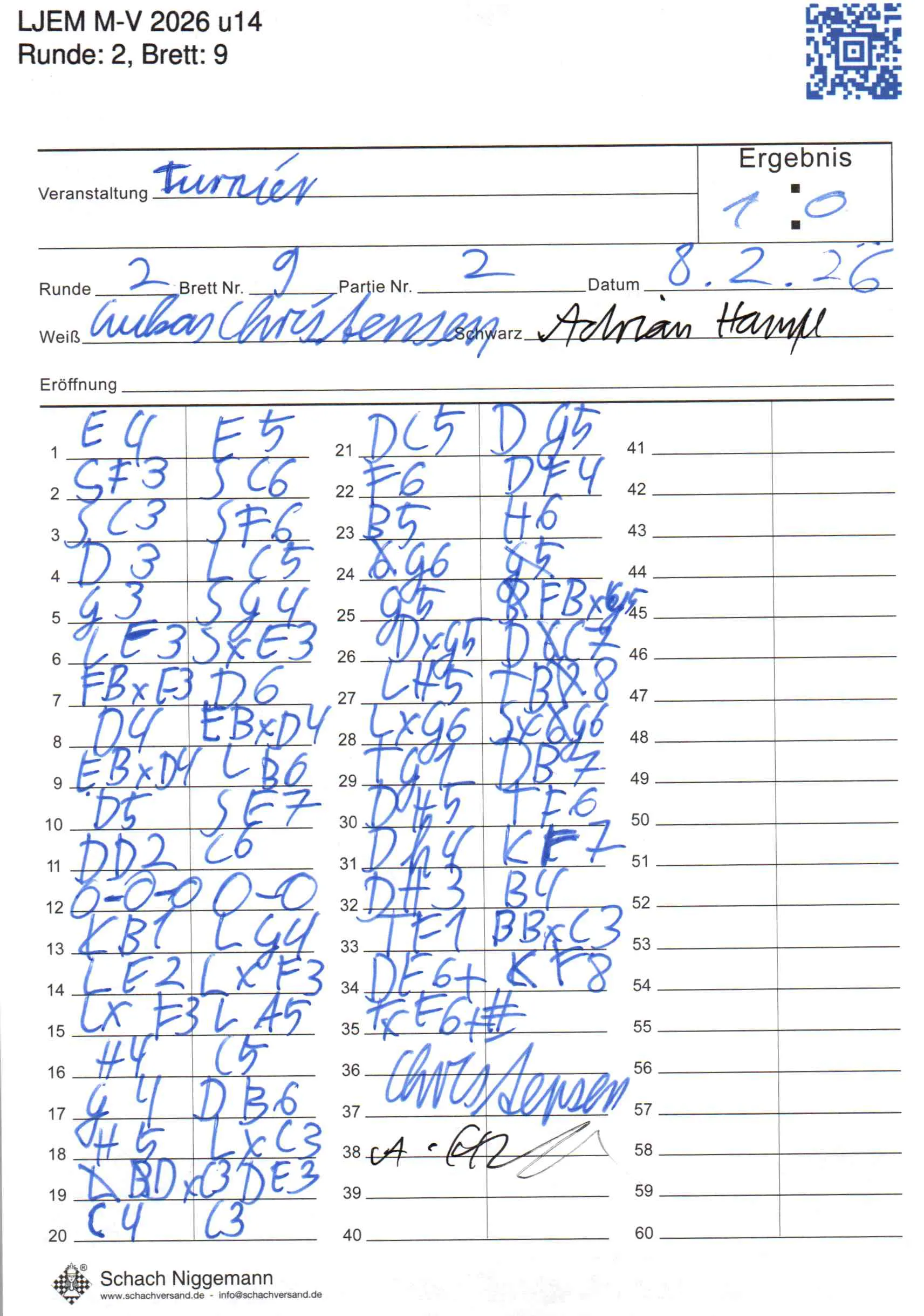 | Weiß: | Christensen, Lukas | Schwarz: | Hampe, Adrian |