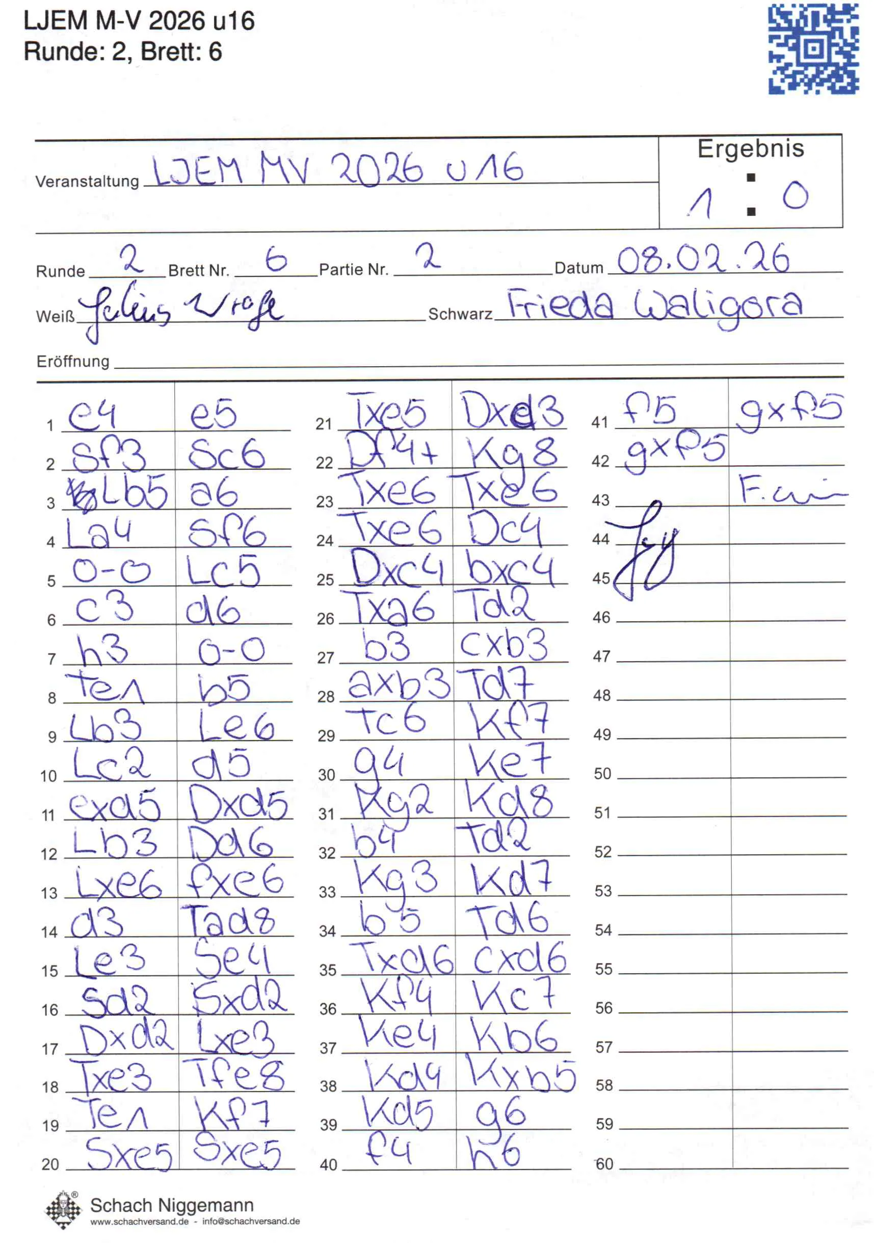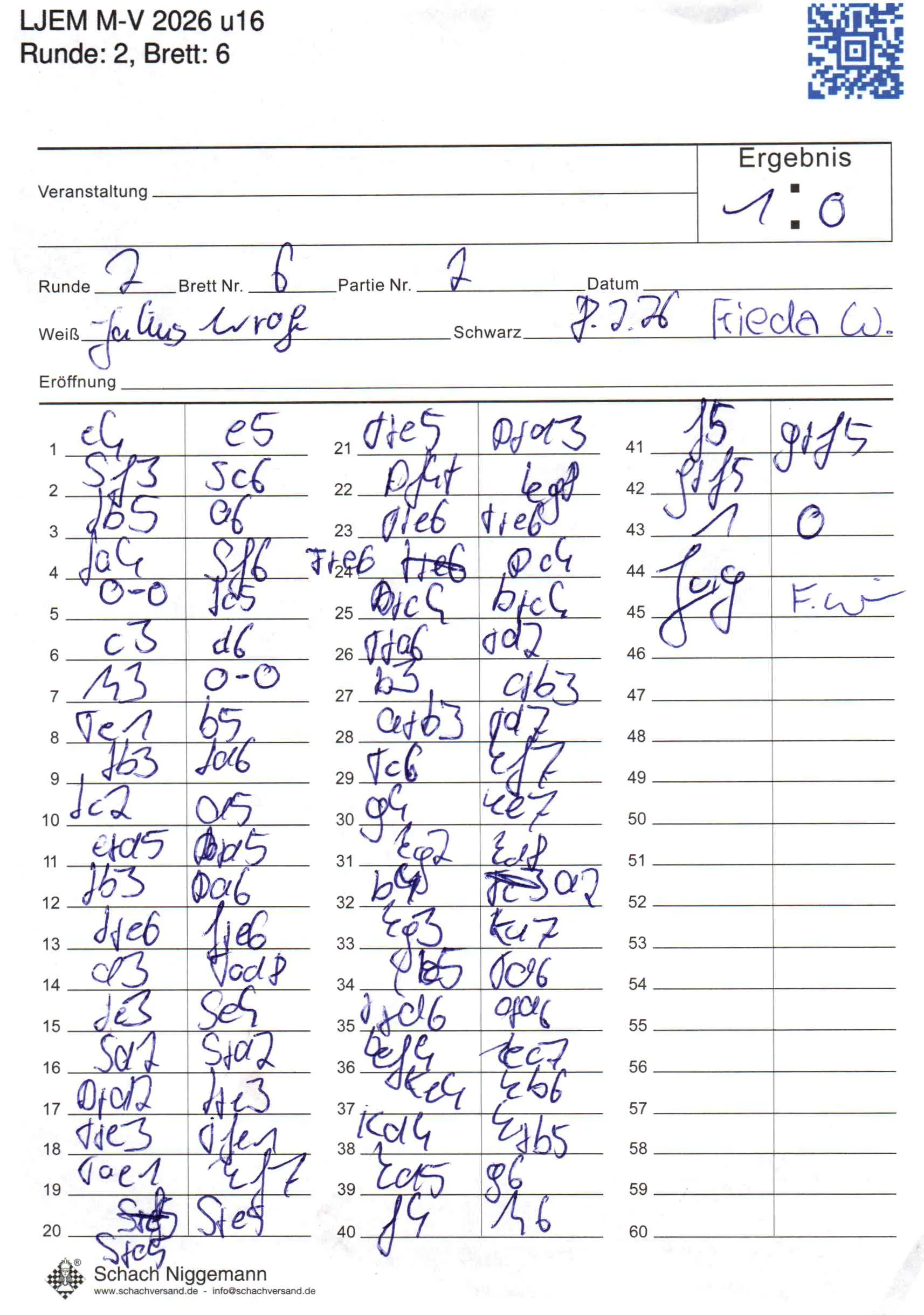 | Weiß: | Wrage, Julius | Schwarz: | Waligora, Frieda |
