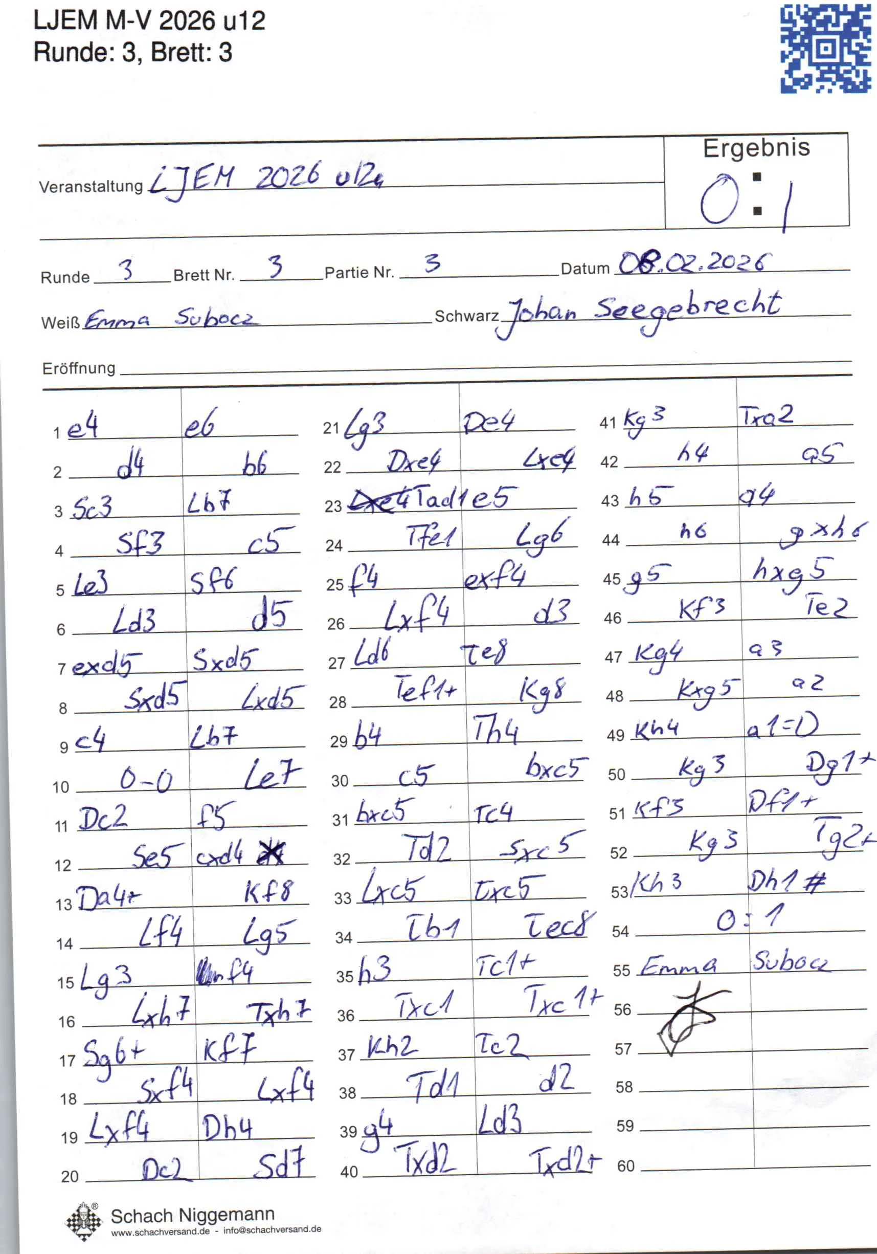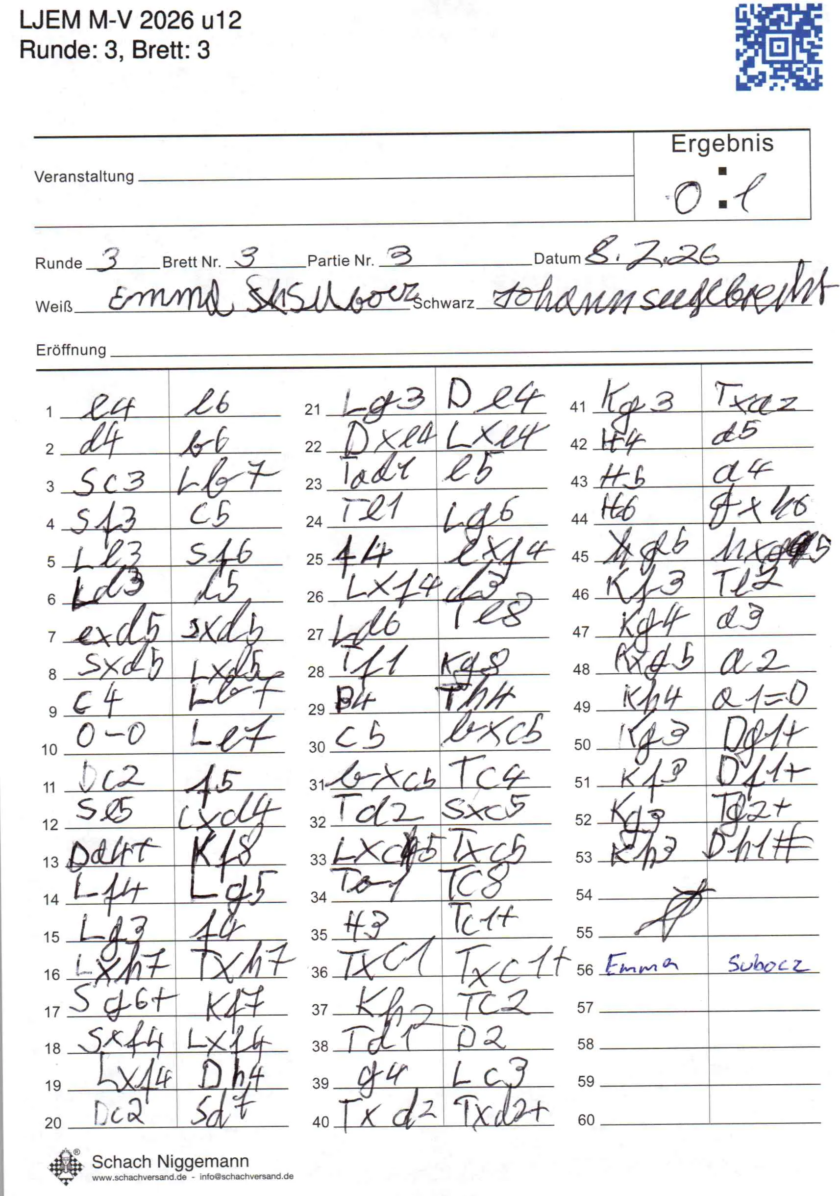 | Weiß: | Subocz, Emma | Schwarz: | Seegebrecht, Johann |