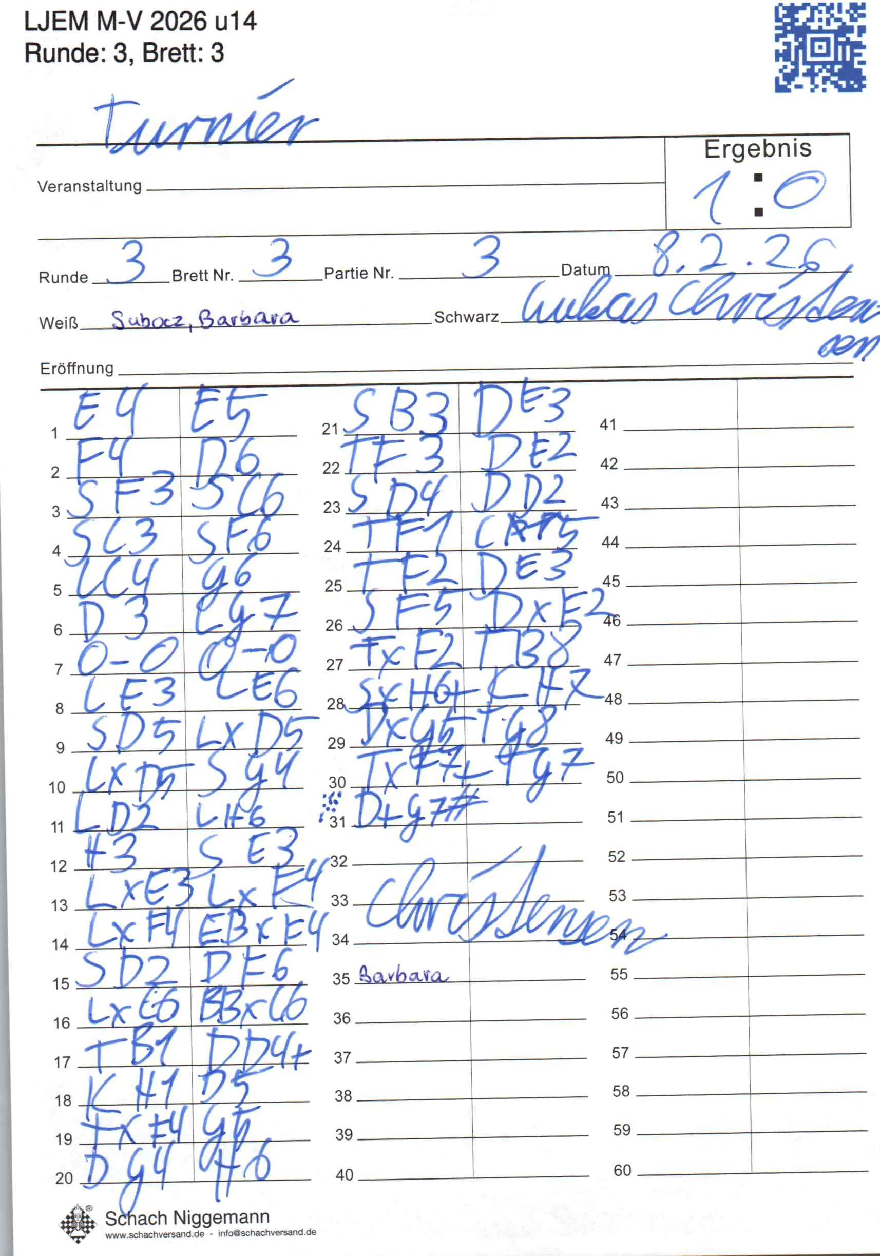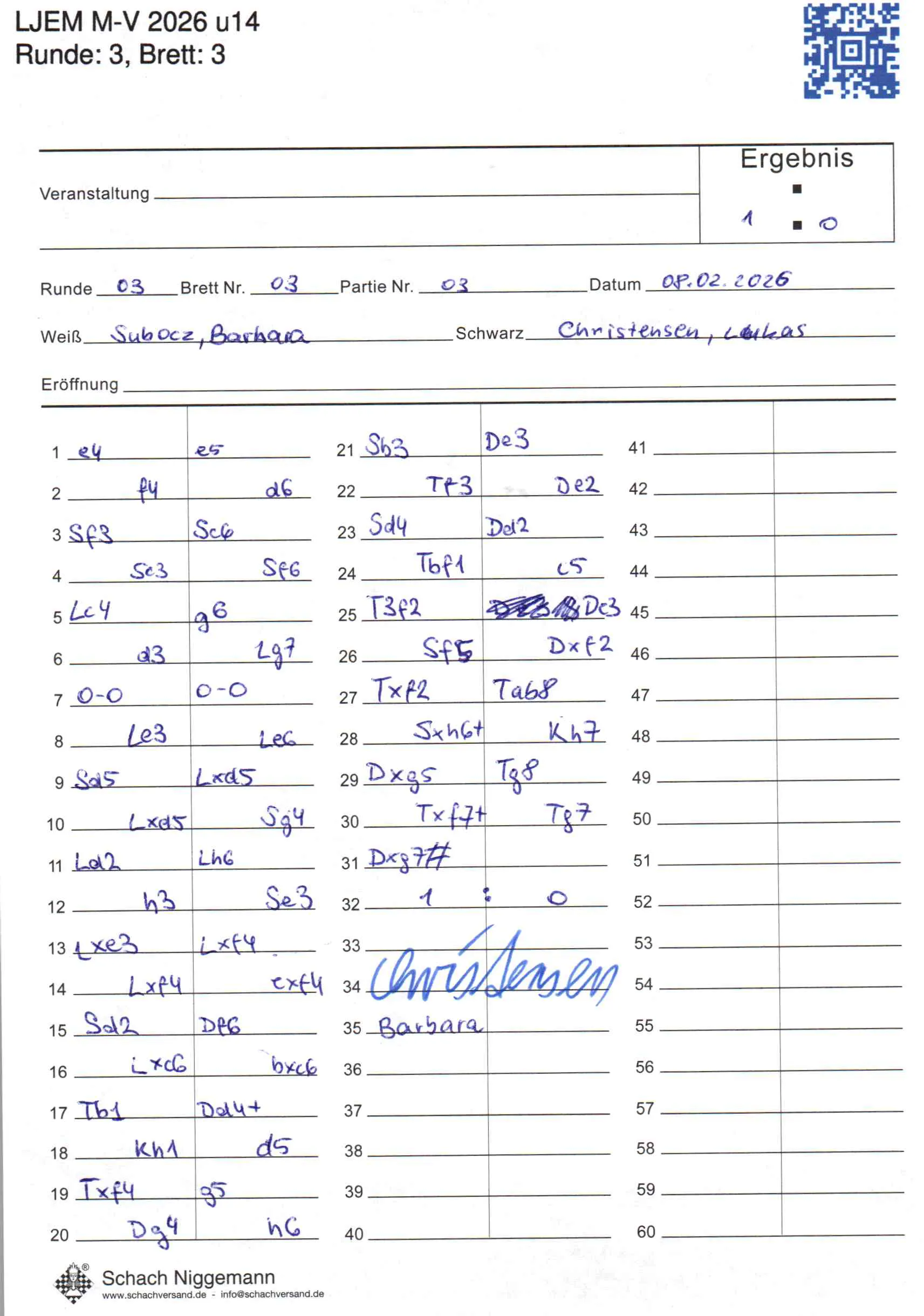 | Weiß: | Subocz, Barbara | Schwarz: | Christensen, Lukas |