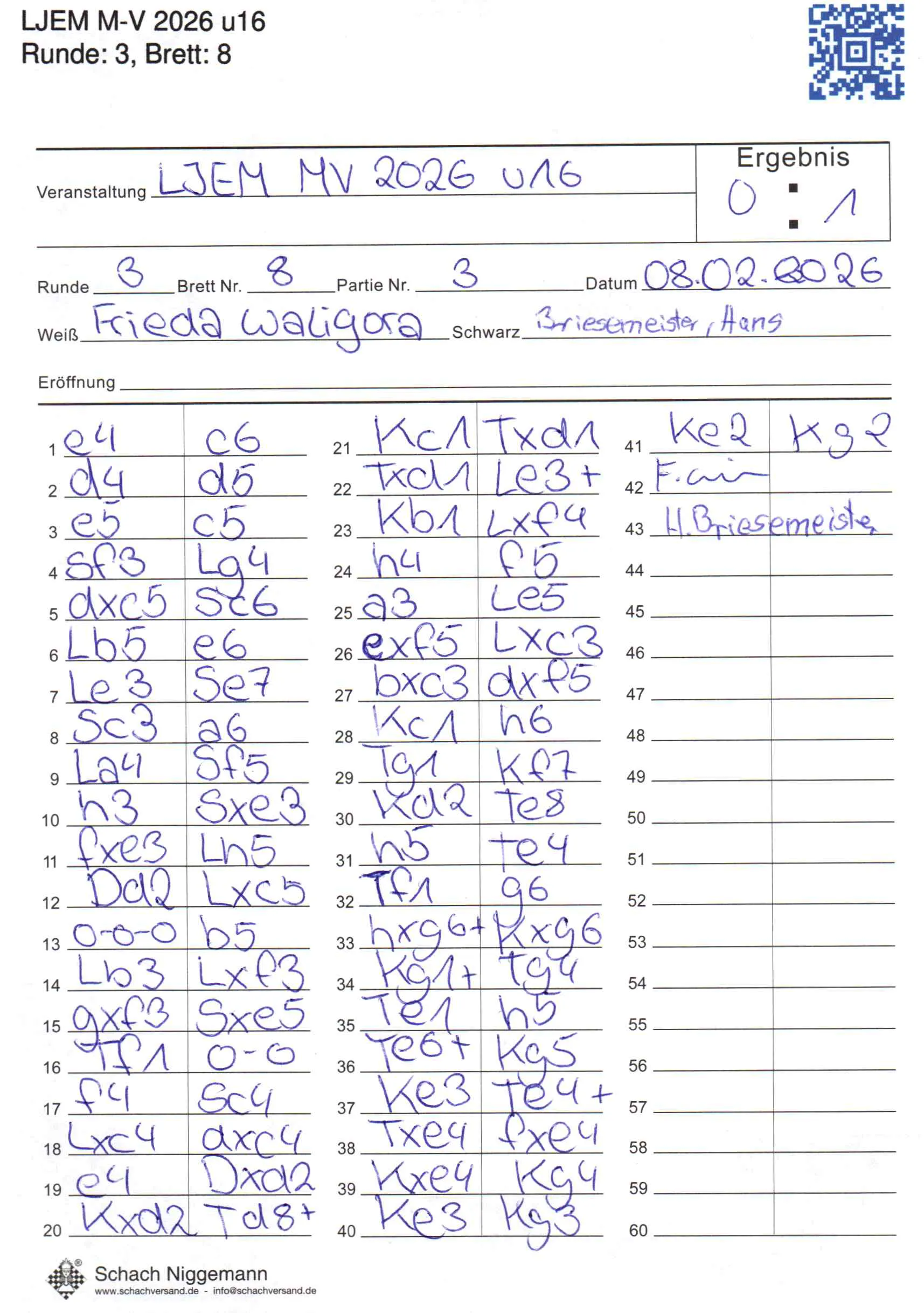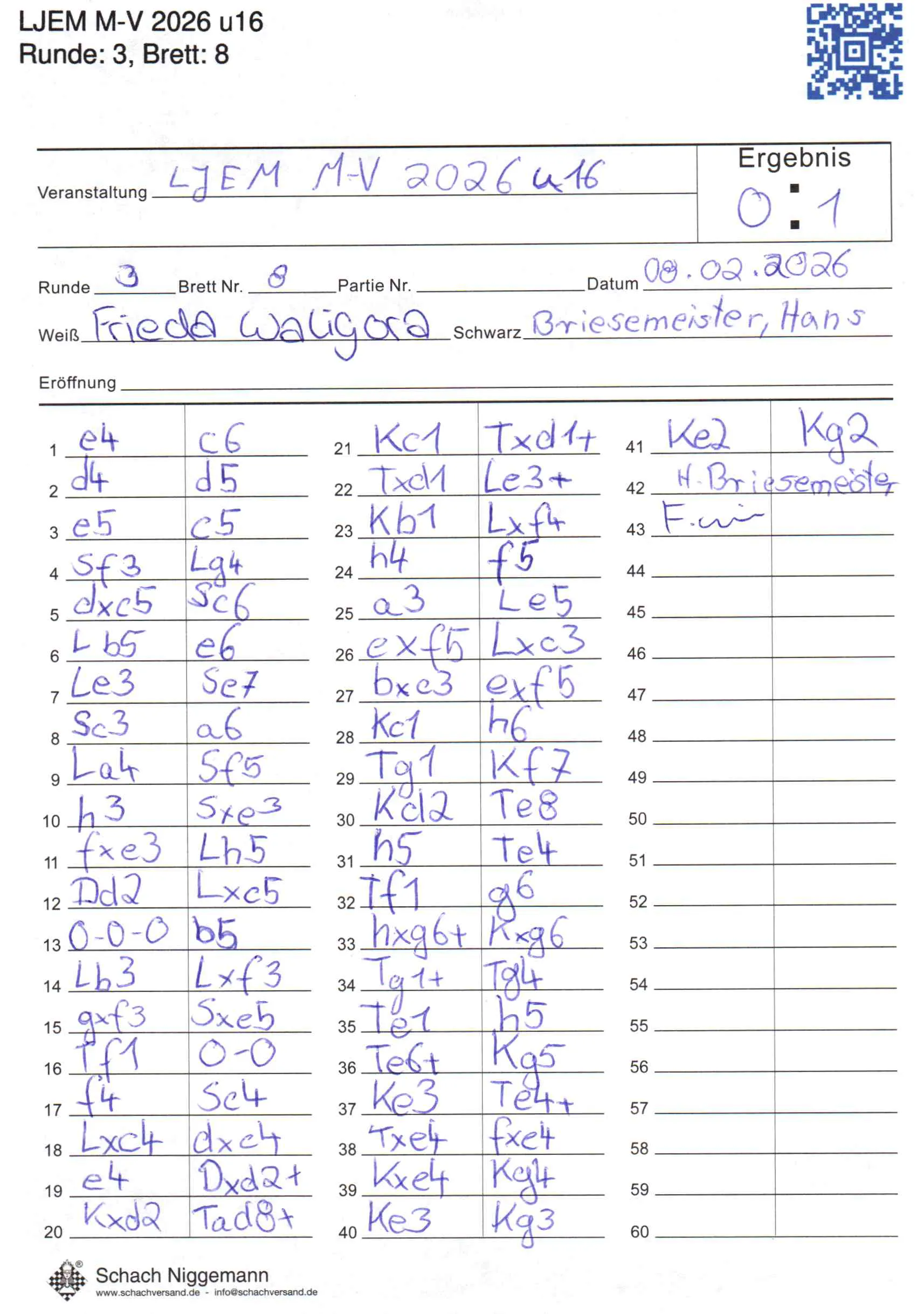 | Weiß: | Waligora, Frieda | Schwarz: | Briesemeister, Hans |
