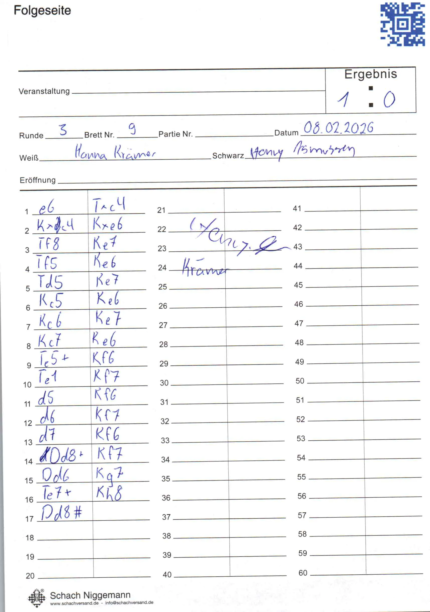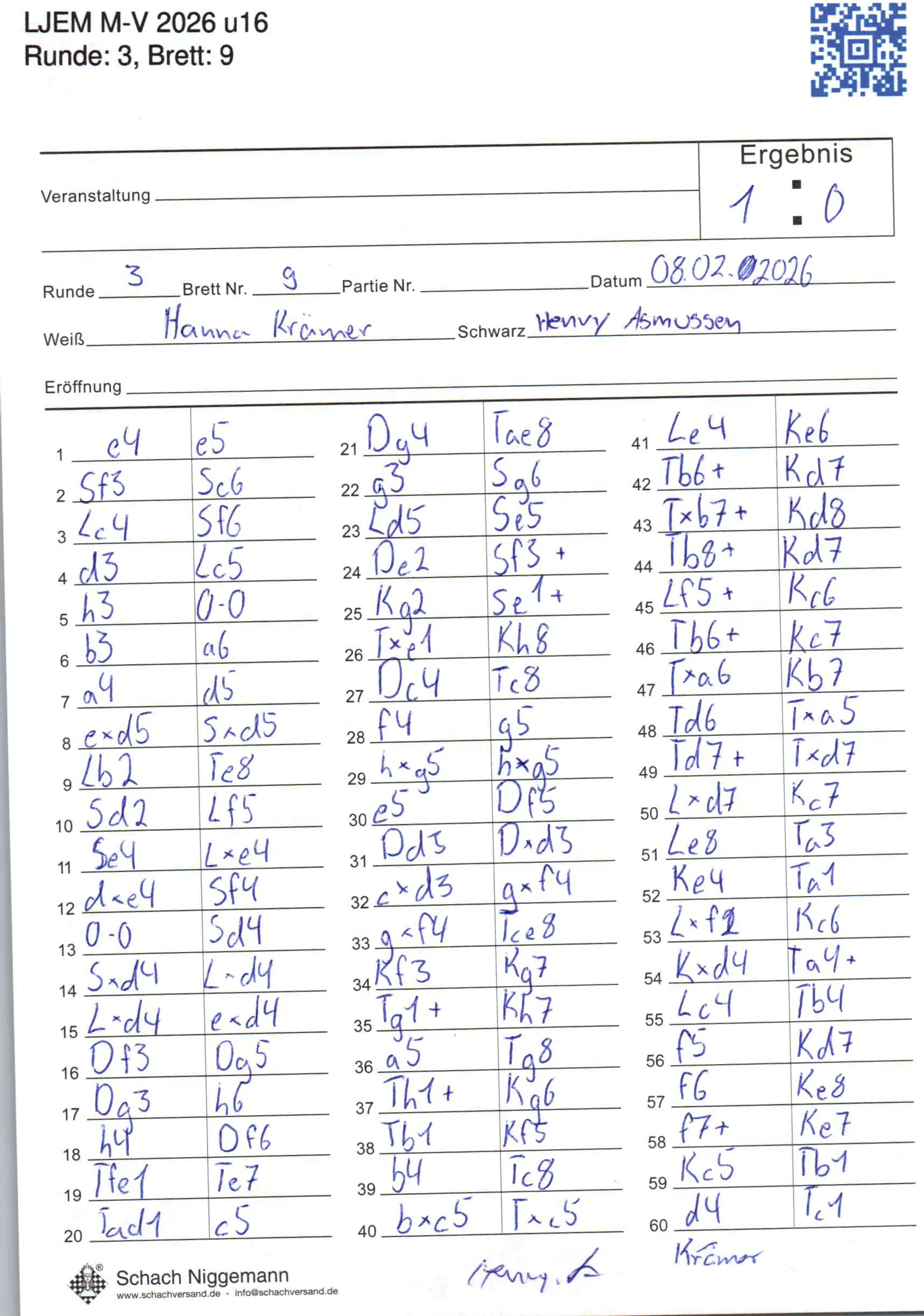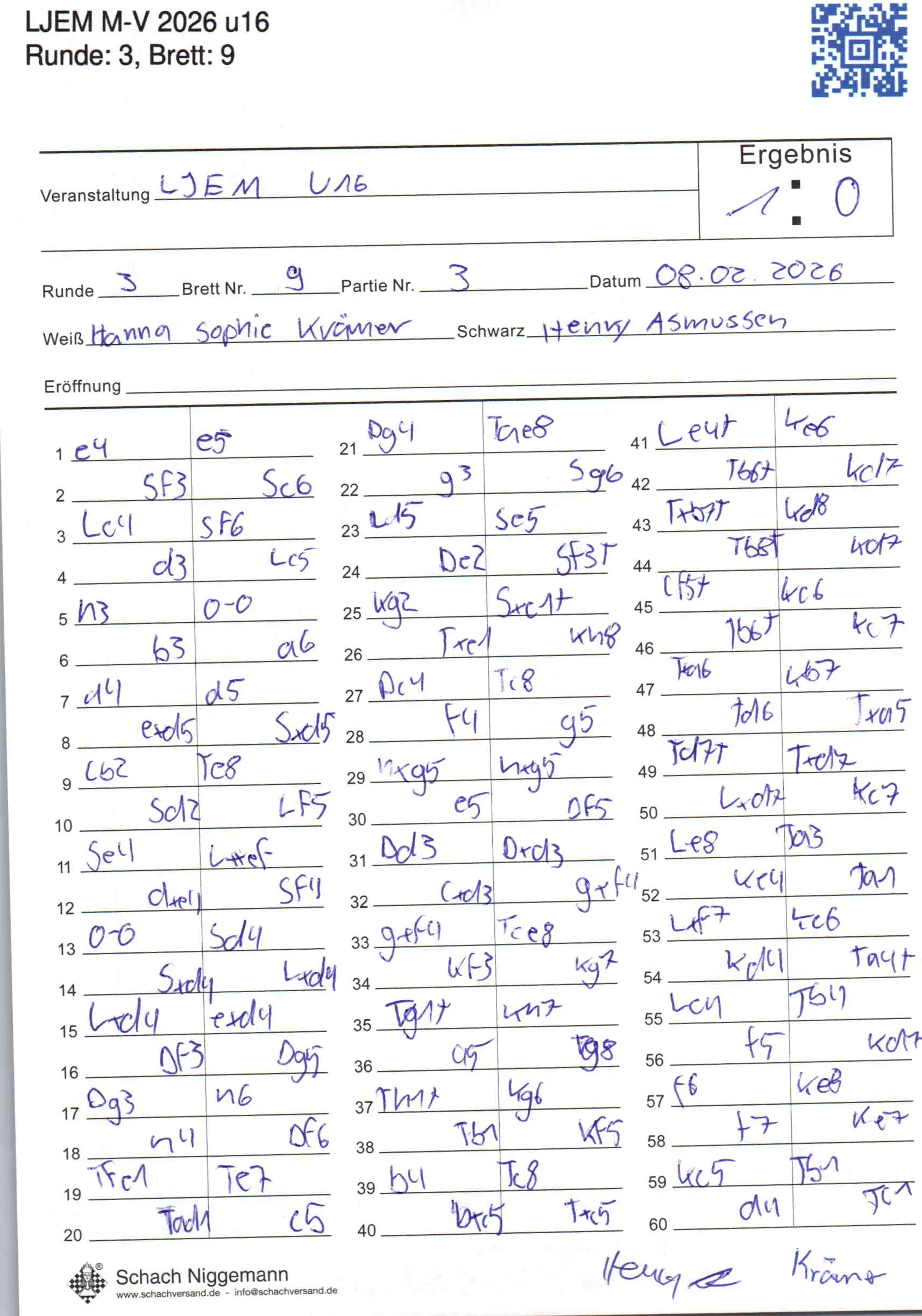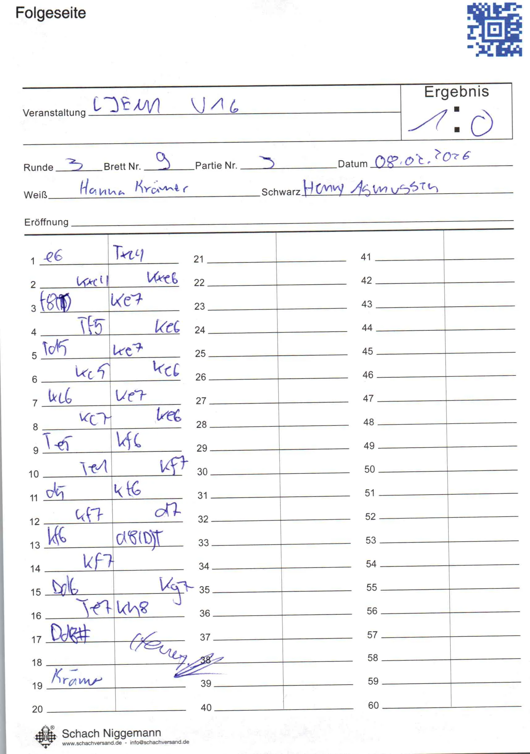 | Weiß: | Krämer, Hanna Sophie | Schwarz: | Asmussen, Henry |