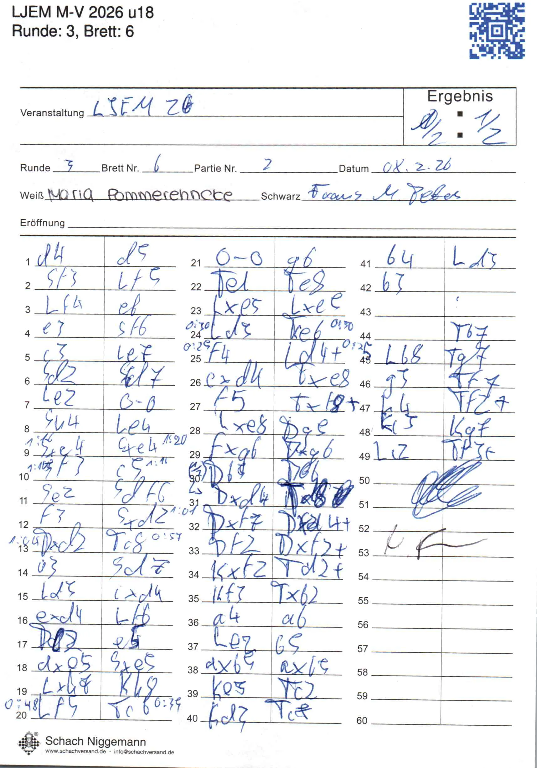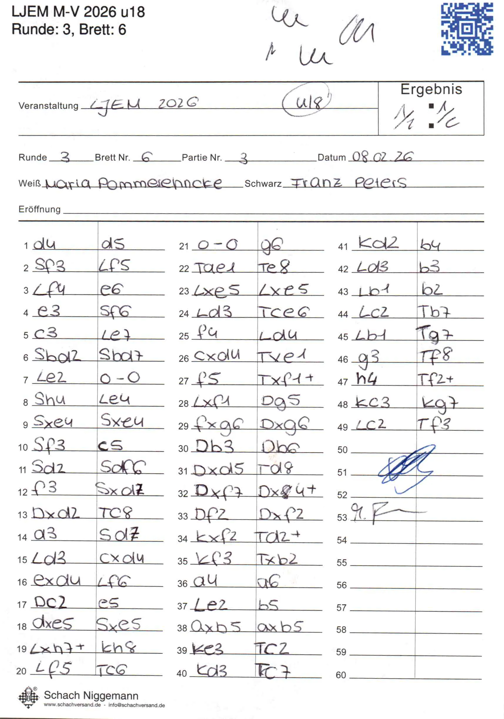 | Weiß: | Pommerehncke, Marla | Schwarz: | Peters, Franz |