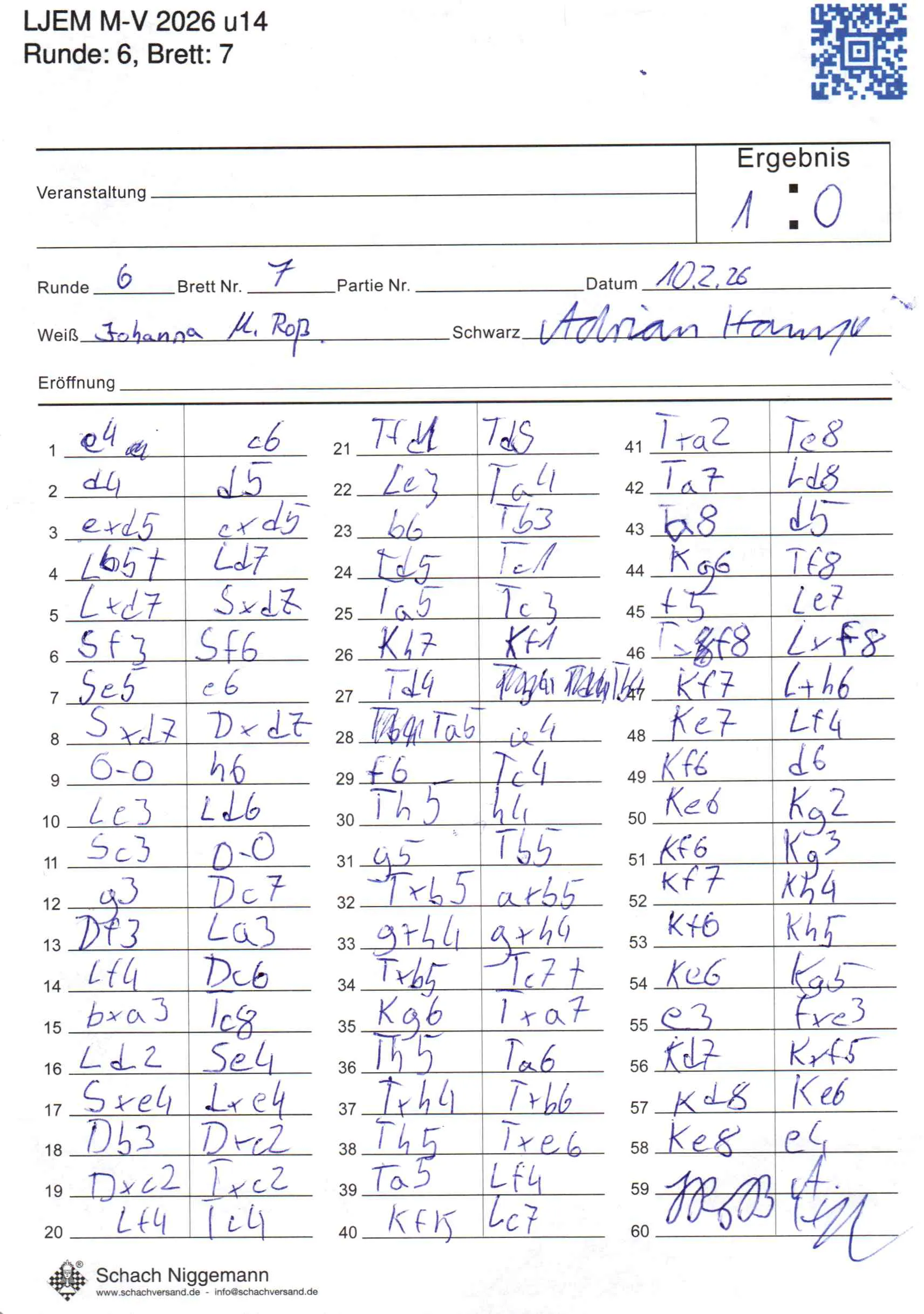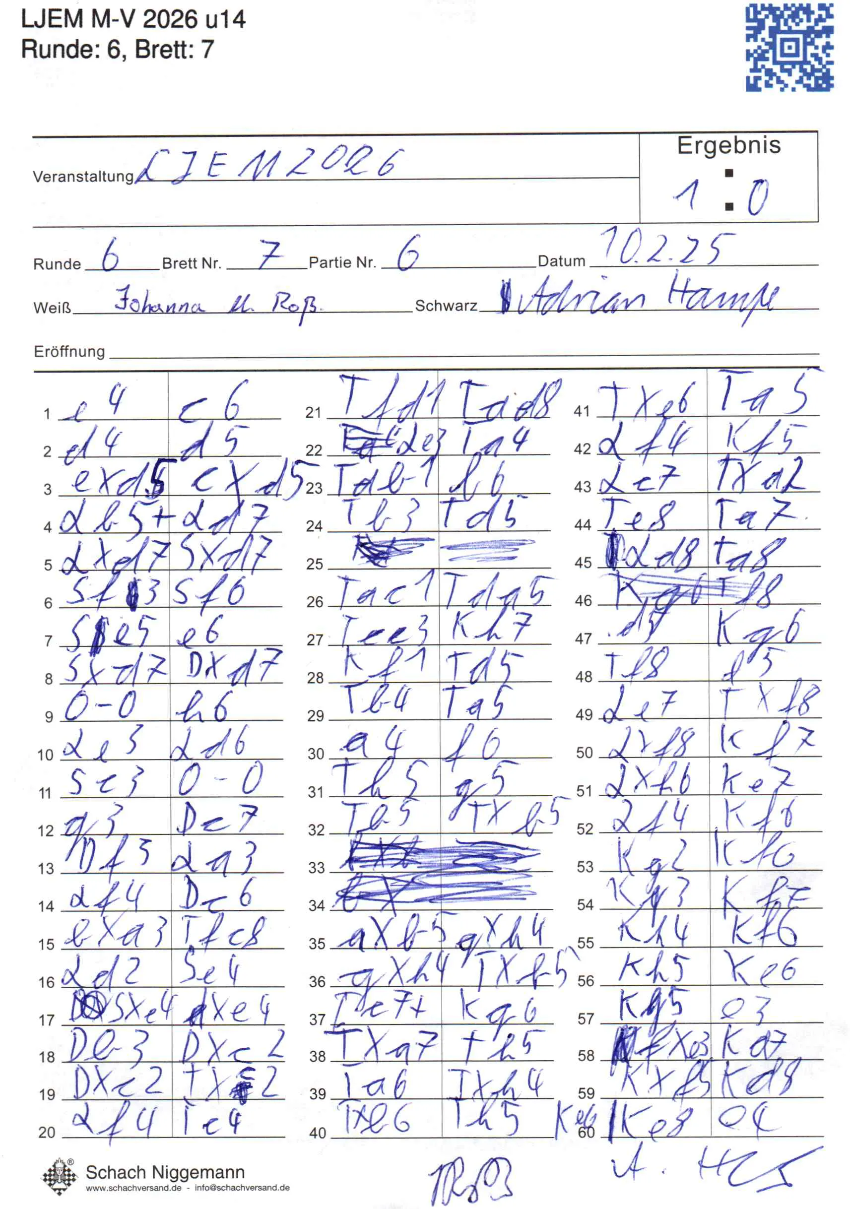 | Weiß: | Roßmann, Johanna Maria | Schwarz: | Hampe, Adrian |