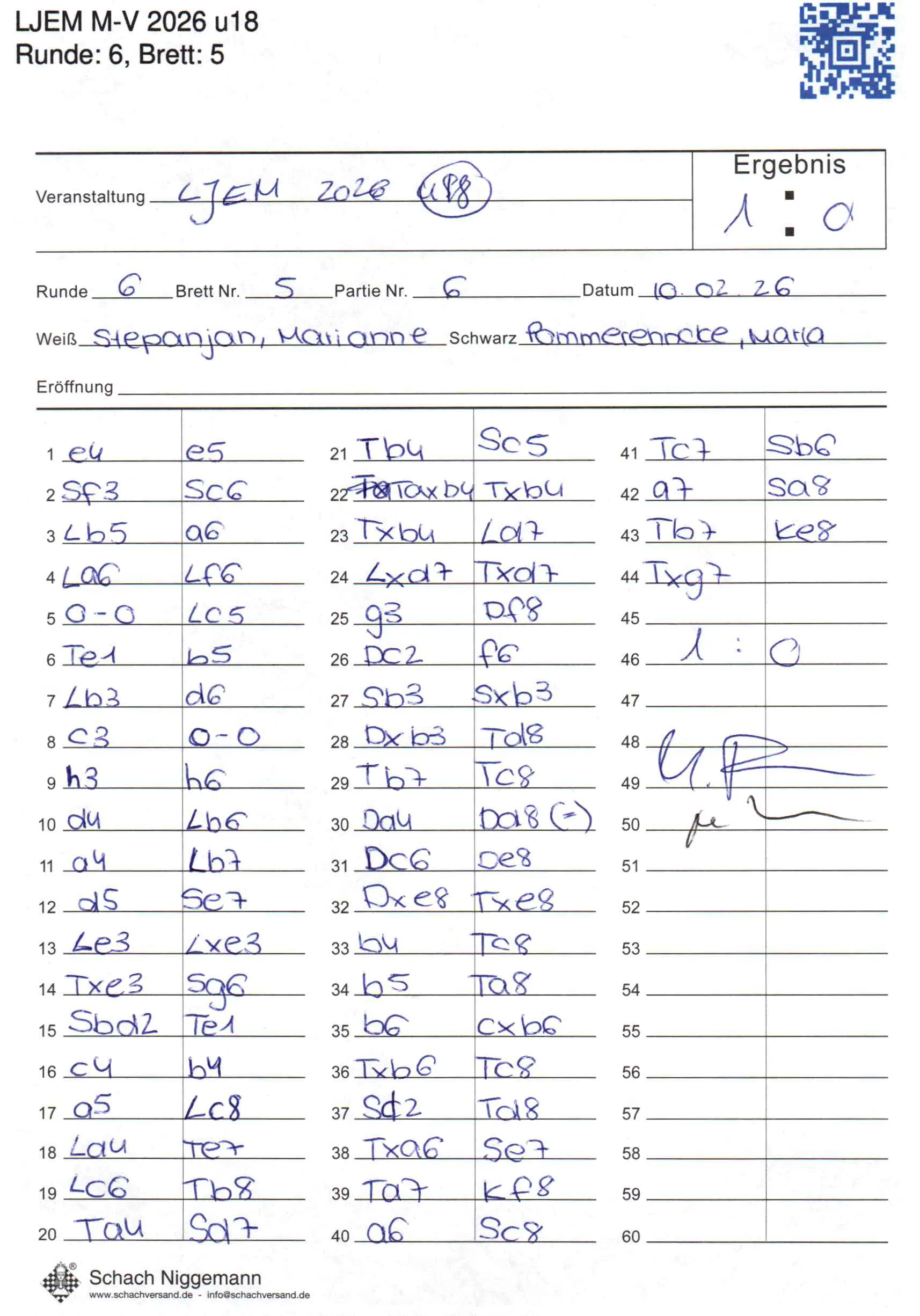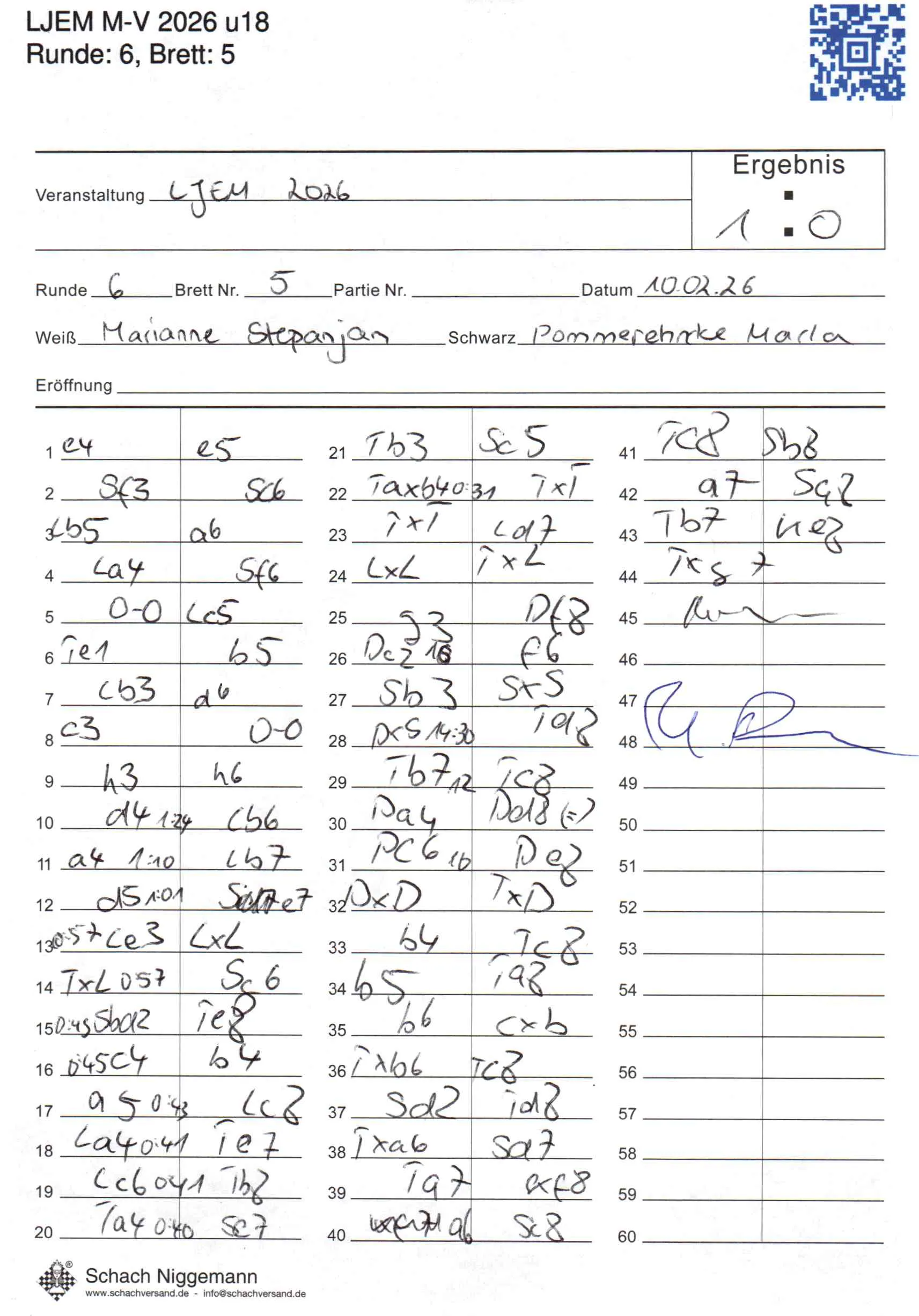 | Weiß: | Stepanjan, Marianne | Schwarz: | Pommerehncke, Marla |