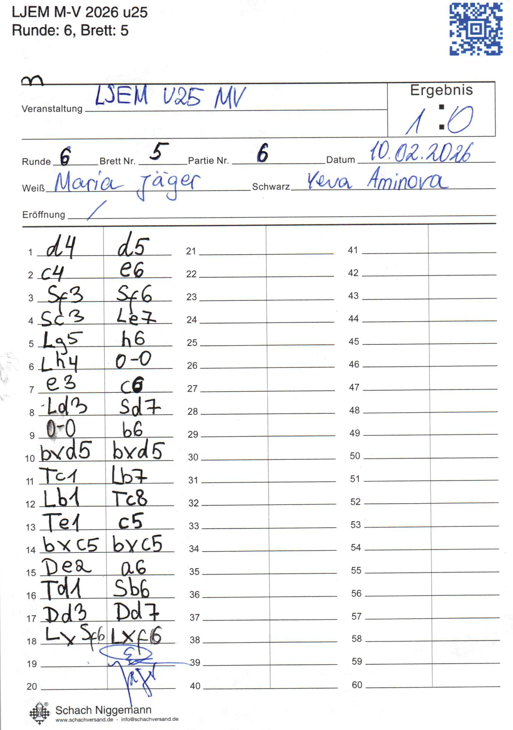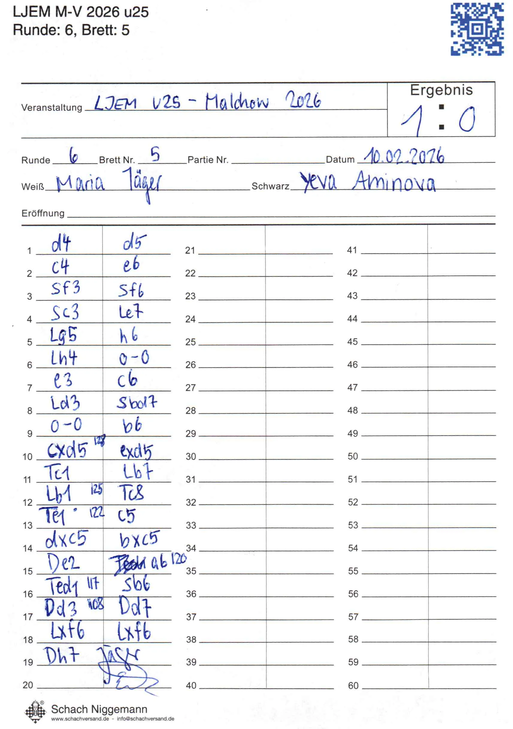 | Weiß: | Jäger, Maria | Schwarz: | Aminova, Yeva |