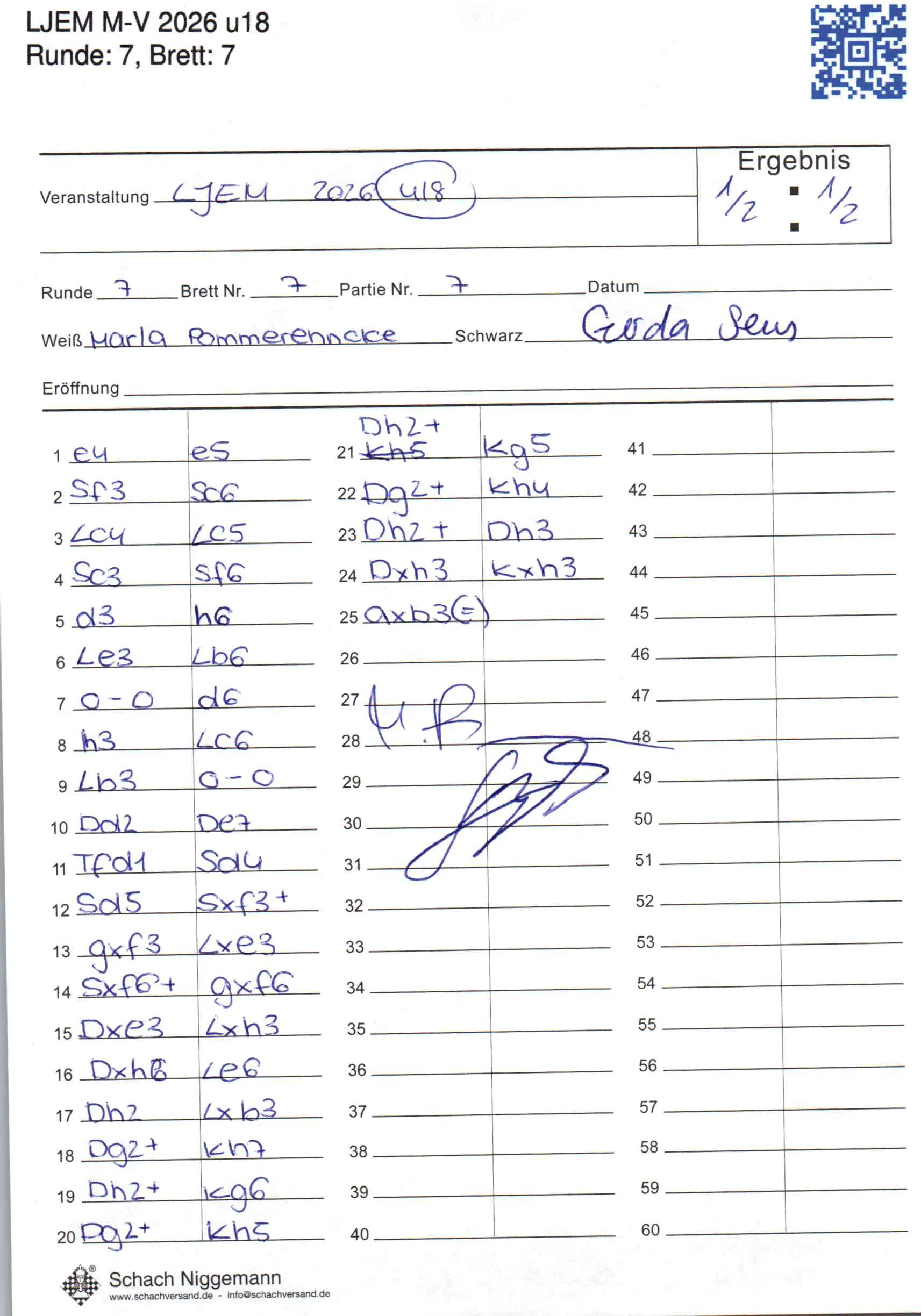| Weiß: | Pommerehncke, Marla | Schwarz: | Sens, Gerda |