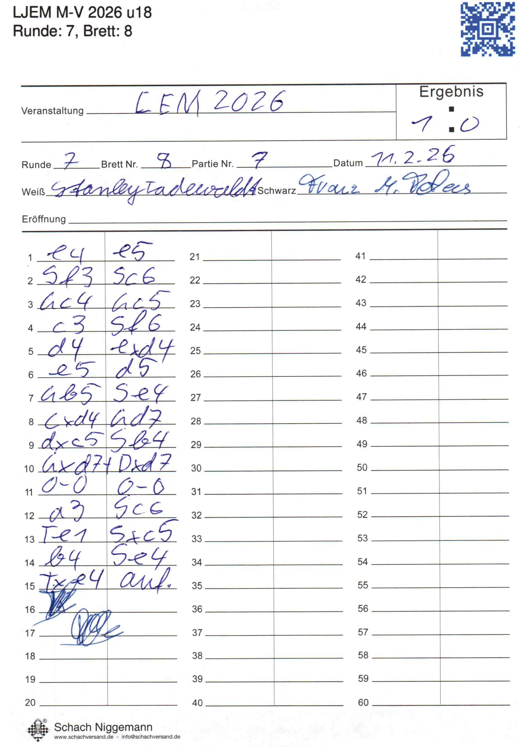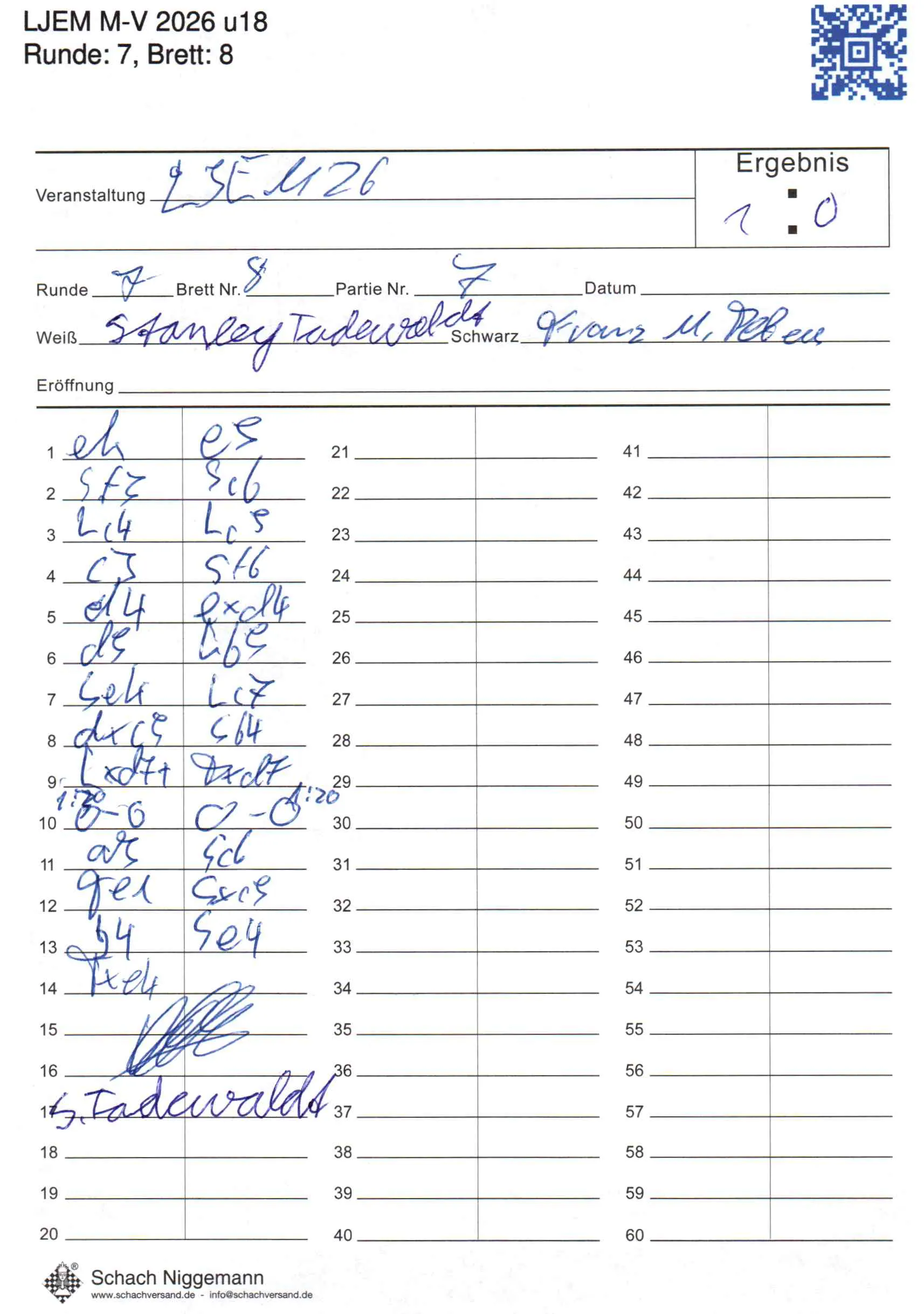 | Weiß: | Tadewaldt, Stanley Fiete | Schwarz: | Peters, Franz |