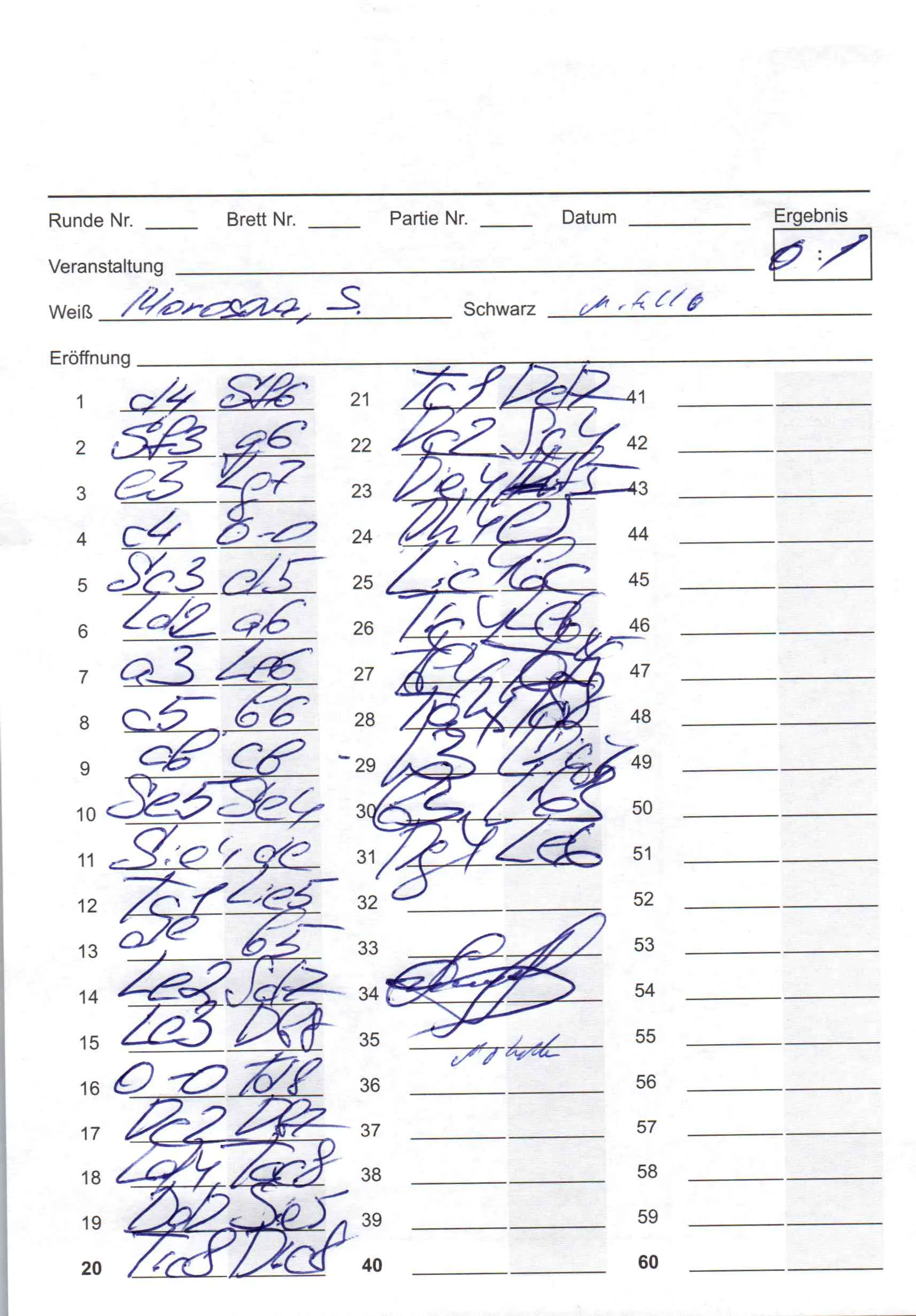 | Weiß: | Morosova,Svetlana | Schwarz: | Motullo,Jens |